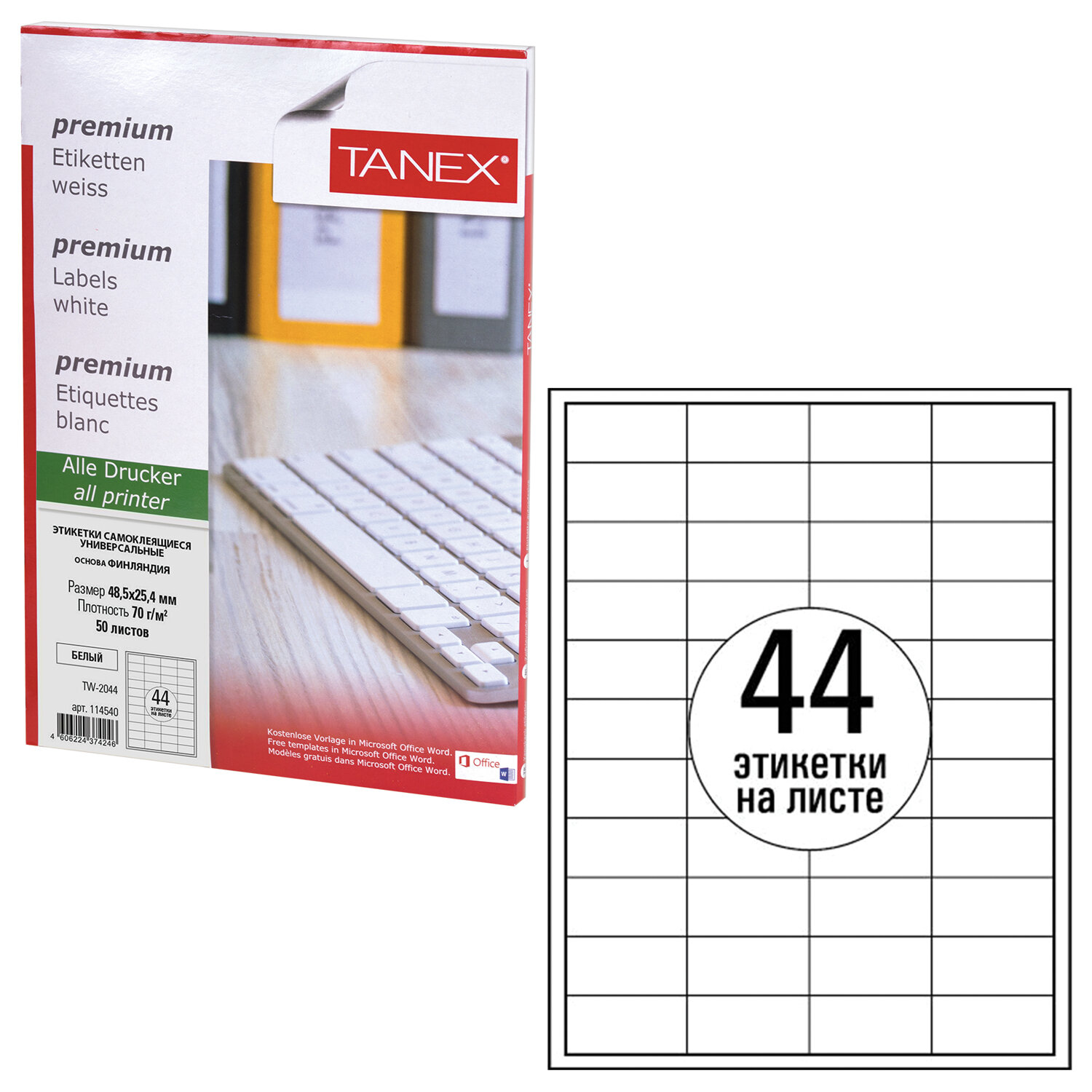 Этикетка самоклеящаяся 48,5х25,4 мм, 44 этикетки, белая, 70 г/м2, 50 листов, TANEX, сырье Финляндия, 114540 Код товара: 114540 590,11 ₽ Купить Производитель:TANEX Универсальные самоклеящиеся этикетки TANEX производятся из высококачественного сырья ведущего европейского производителя UPM-Kymmene, Финляндия. Самоклеящиеся этикетки позволят быстро и качественно подготовить адресные наклейки, регистрационные номера, аннотации при помощи лазерного или струйного принтера. Изготовлены из матовой бумаги белого цвета плотностью 70 г/м2. Картонная упаковка содержит 50 листов формата А4, на каждом листе – сорок четыре этикетки размером 48,5х25,4 мм. Для оформления и печати этикеток откройте текстовый редактор Word, выберите вкладку "Рассылки", затем "Наклейки", далее "Параметры", из раскрывающегося списка поставщиков выберите "TANEX", тип – TANEX 2044. Нажмите кнопку "Создать". Для организации печати этикеток можно также использовать наш шаблон. Чтобы увидеть разлиновку шаблона, необходимо в ПО Microsoft Word открыть вкладку «Макет» и щелкнуть «Отобразить сетку».Производство: ТурцияКоличество этикеток на листе: 44 шт.Размер этикетки (ДхШ): 48,5х25,4 ммФорма: прямоугольнаяКоличество листов в упаковке: 50 шт.Технология печати: для лазерной печати, для струйной печатиСерия: UNIVERSALПлотность: 70 г/м2Тип поверхности: матоваяЦвет этикетки: белыйСпецэффект цвета: нетШаблон для скачивания: даВес: 508 грРазмер упаковки: 1.2 × 30.3 × 21.7 смОбъём: 0.0009 м3Промежуточная упаковка: 20 штТранспортная упаковка: 20 штШтрих-код: 4606224374246 Файлы Приложение-1.docx Сертификат-1.jpg Сертификат-2.jpg Сертификат-3.jpg Сертификат-4.jpg Сертификат-5.jpg Сертификат-6.jpg Сертификат-7.jpg Сертификат-8.jpg Сертификат-9.jpg Сертификат-10.jpg Сертификат-11.jpg Сертификат-12.jpg Сертификат-13.jpg Сертификат-14.jpg Сертификат-15.jpg Сертификат-16.jpg Сертификат-17.jpg Сертификат-18.jpg Сертификат-19.jpg Сертификат-20.jpg Сертификат-21.jpg Сертификат-22.jpg Сертификат-23.jpg Сертификат-24.jpg Сертификат-25.jpg Сертификат-26.jpg