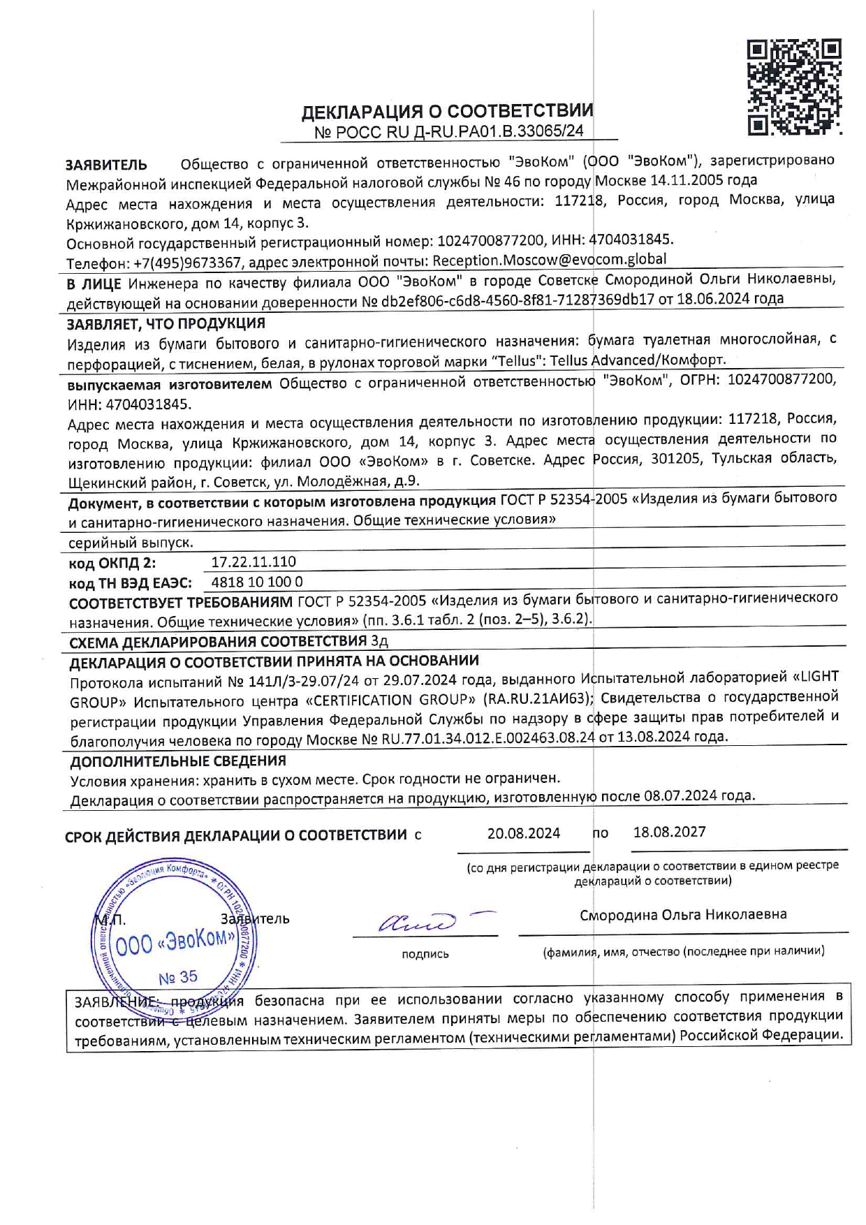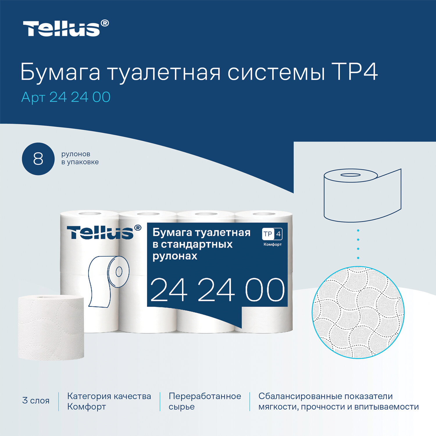 Бумага туалетная Tellus/TORK КОМФОРТ (Система ТР4), спайка 8 рулонов по 16 метров, 3-слойная Код товара: 118795 293,24 ₽ Купить Производитель:Tellus/TORK Трехслойная бумага Tellus имеет высокие показатели мягкости, прочности и впитываемости, что делает использование более комфортным. Трехслойная туалетная бумага Tellus в стандартных рулонах категории качества КОМФОРТ предназначена для туалетных комнат с небольшой проходимостью – в офисах, мини-отелях, учебных и административных помещениях. Рулоны туалетной бумаги Tellus подходят для помещений, где важны гигиеничность, экономичность и удобство, а система T4 (ТР4) помогает поддерживать чистоту в туалетных комнатах при минимальных затратах на обслуживание. Длина рулона – 16 метров.Производство: РоссияДиспенсерная система: Т4 (ТР4)Тип: рулонныеСырье: облагороженная макулатураКоличество слоев: 3Тиснение: даПерфорация: даДоля вторичного сырья: 100 %Спайка/комплект: 8 штДлина намотки: 16 мДиаметр рулона: 113 ммШирина рулона: 9.2 смВнутренний диаметр втулки: 45 ммРазмер листа: 9,2х12,2 смКоличество листов в рулоне/пачке: 132Цвет: белыйСочетается с оборудованием других производителей: даСерия: КомфортВес: 635 грРазмер упаковки: 18.4 × 11.3 × 41.6 смОбъём: 0.0086 м3Промежуточная упаковка: 7 штТранспортная упаковка: 7 штШтрих-код: 4670199852122 Файлы Приложение-1.pdf Сертификат-1.jpg Сертификат-2.jpg