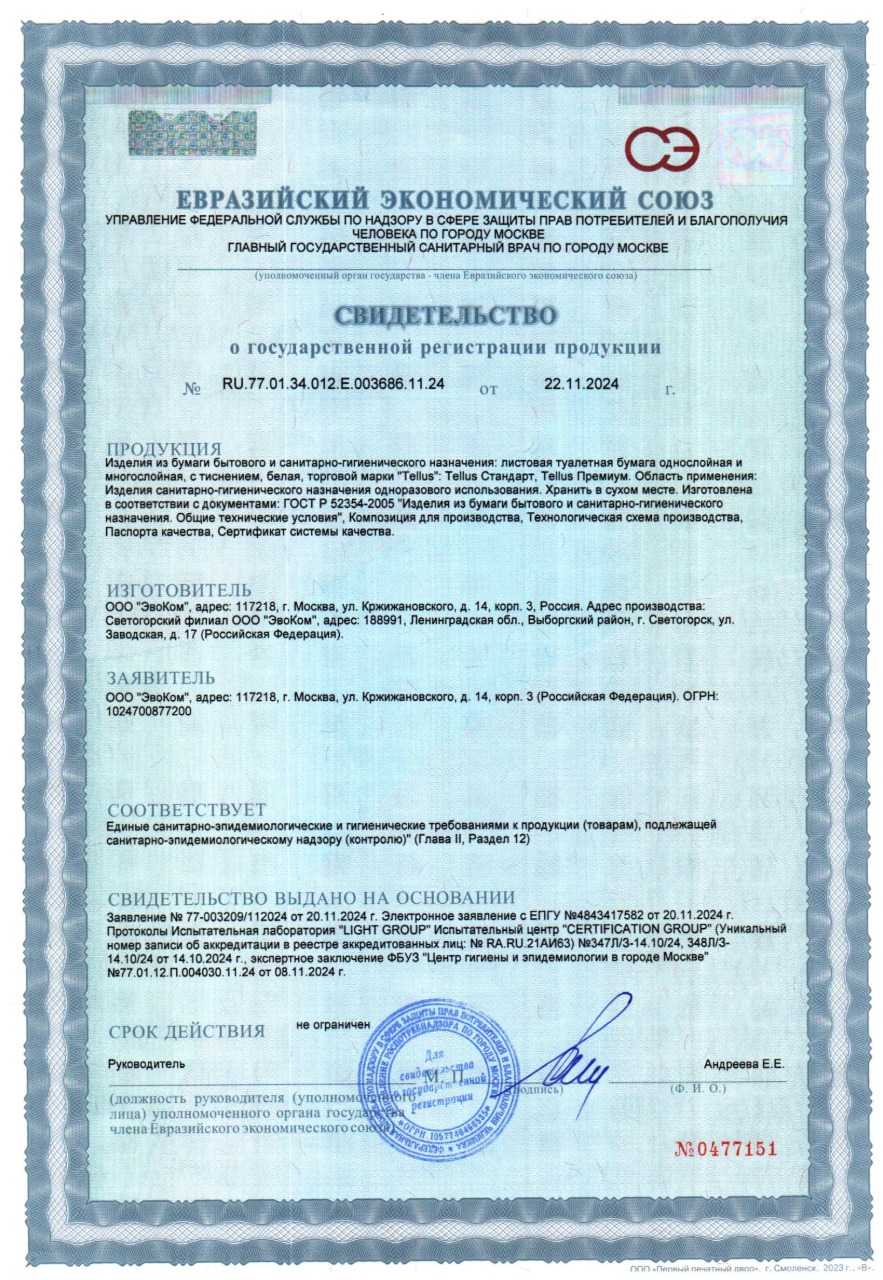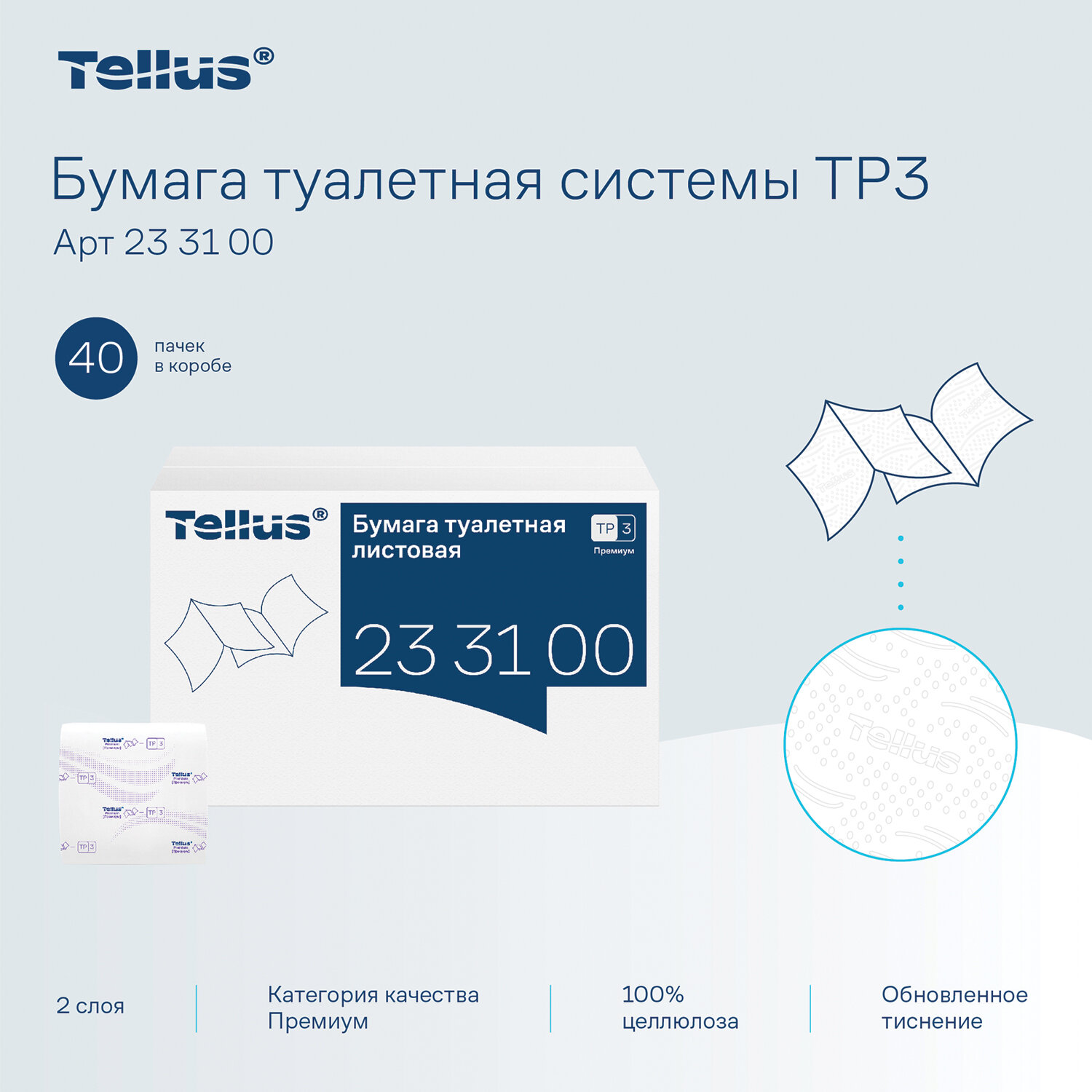 Бумага туалетная листовая Tellus/TORK (Система ТР3) ПРЕМИУМ КОМПЛЕКТ 40 шт., 200 л., 11х23 см, 2-слойная Код товара: 118797 5 164,86 ₽ Купить Производитель:Tellus/TORK Туалетная бумага листовая Tellus/TORK (система Т3): премиум?качество для безупречной гигиены. Объединяет качество и экономичный расход. Бумага мягкая, белая, отлично подходит для помещений с низкой и средней проходимостью. Лист имеет размеры 11х23 см. Туалетная бумага Tellus подходит для использования в диспенсерах системы T3/TР3, обеспечивающих полистовой отбор и контроль расхода. Категория качества – Премиум. Произведено из 100% целлюлозы. 200 листов в упаковке.Производство: РоссияДиспенсерная система: Т3Тип: листоваяСырье: 100% целлюлозаКоличество слоев: 2Тиснение: даПерфорация: отдельные листыДоля вторичного сырья: 0 %Спайка/комплект: 40 штДлина намотки: 0 мШирина рулона: 0 смВнутренний диаметр втулки: 0 ммРазмер листа: 11х23 смШирина спайки: 41 смВысота спайки: 23 смКоличество листов в рулоне/пачке: 200Цвет: белыйСочетается с оборудованием других производителей: даСерия: PremiumВес: 8,23 кгРазмер упаковки: 22.9 × 41.2 × 60.4 смОбъём: 0.057 м3Промежуточная упаковка: 1 штТранспортная упаковка: 1 штШтрих-код: 4670199851736 Файлы Приложение-1.pdf Приложение-2.pdf Сертификат-1.jpg Сертификат-2.jpg
