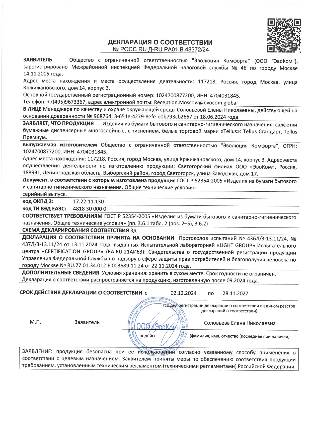 Салфетки Tellus/TORK (Система NS4) ПРЕМИУМ, 2-слойные, КОМПЛЕКТ 20 шт., 200 шт., белые Код товара: 118798 4 460,92 ₽ Купить Производитель:Tellus/TORK Диспенсерные салфетки TORK идеально подходят для использования в гостиничном секторе, местах общественного питания, в медицинских, косметологических сферах, в торговых комплексах и бизнес-центрах. Двухслойные диспенсерные салфетки Tellus изготовленные из высококачественной целлюлозы, обладают хорошей впитывающей способностью. Подходят для диспенсерных систем N4/NS4.Производство: РоссияДиспенсерная система: N4Количество салфеток: 200 шт.Количество слоев: 2Тип сложения: VДлина салфетки: 23 смШирина салфетки: 16 смЦвет салфеток: белыйАртикул: 773100Серия: ПРЕМИУМСырье: 100% целлюлозаДоля вторичного сырья: 0 %Высота коробки/пачки: 16.9 смШирина коробки/пачки: 41 смГлубина коробки/пачки: 60 смКоличество комплектов: 20 шт.Вес: 6,44 кгРазмер упаковки: 16.9 × 41 × 60 смОбъём: 0.0416 м3Промежуточная упаковка: 1 штТранспортная упаковка: 1 штШтрих-код: 4670199851491 Файлы Приложение-1.pdf Приложение-2.pdf Сертификат-1.jpg Сертификат-2.jpg