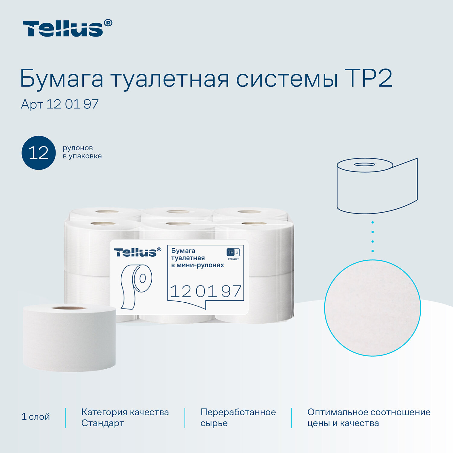 Бумага туалетная 200 метров, Tellus/TORK (Система T2) UNIVERSAL, 1-слойная, КОМПЛЕКТ 12 рулонов Код товара: 124545 1 706,69 ₽ Купить Производитель:Tellus/TORK Туалетная бумага однослойная в мини-рулонах категории Tellus качества Стандарт удовлетворяет базовые потребности, предлагая экономичное решение для помещений со средней и высокой проходимостью. Диспенсеры системы T2 (ТР2) помогают сократить затраты и уменьшить время на обслуживание за счет большего объема бумаги по сравнению со стандартными рулонами. - Категория качества – Стандарт; - Произведено из переработанного сырья; - Длина рулона – 200 м. Артикул: Tellus 120197.Производство: РоссияДиспенсерная система: Т2 (ТР2)Тип: рулонныеСырье: облагороженная макулатураКоличество слоев: 1Перфорация: нетДоля вторичного сырья: 100 %Спайка/комплект: 12 штДлина намотки: 200 мДиаметр рулона: 158 ммШирина рулона: 9.2 смВнутренний диаметр втулки: 60 ммЦвет: белыйСочетается с оборудованием других производителей: даРастворяется в воде: даСерия: СТАНДАРТВес: 6,04 кгРазмер упаковки: 18.3 × 48.8 × 32.1 смОбъём: 0.0287 м3Промежуточная упаковка: 1 штТранспортная упаковка: 1 штШтрих-код: 4670199854843 Файлы Приложение-1.pdf Приложение-2.pdf Приложение-3.pdf Приложение-4.pdf Приложение-5.pdf Приложение-6.pdf Сертификат-1.jpg Сертификат-2.jpg