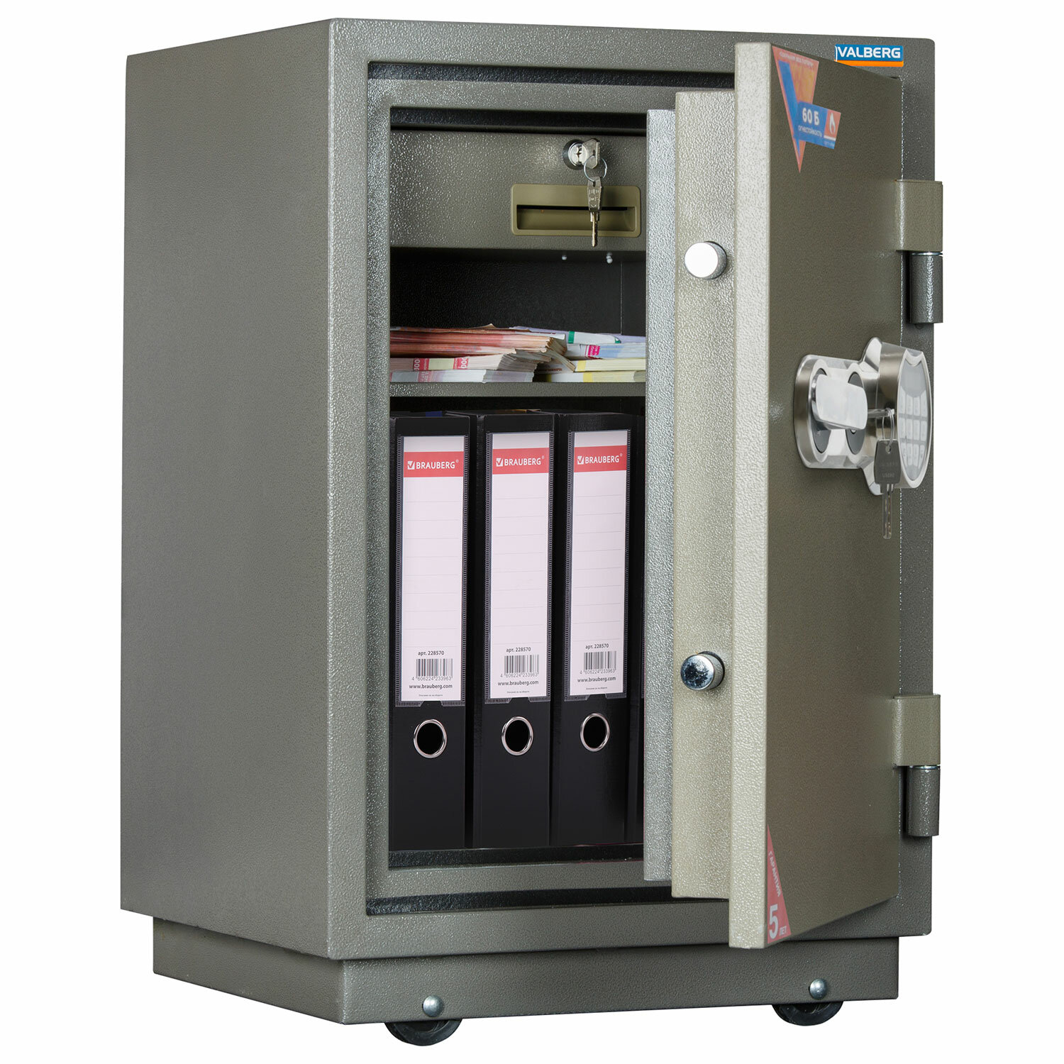 Сейф огнестойкий VALBERG "FRS-73T EL", 732х485х431 мм, 86 кг, электронный замок + ключ, трейзер, крепление к полу Код товара: 290385 44 407,68 ₽ Купить Производитель:VALBERG Массивный огнестойкий офисный сейф с кассовым отделением. Предназначены для сохранности документов и ценностей при пожаре. При заливке двери и корпуса сейфа используется запатентованный состав огнестойкого бетона. Тепловой замок, усиленный огнестойким уплотнителем. Оборудованы пластиковыми ножками. Комплектуются кодовым электронным замком + ключевой замок. Внутри сейфа – кассовая ячейка с замком (трейзер 85/343/267), съемная полка. Предусмотрено анкерное крепление к полу (испытание на огнестойкость проведено с анкерным отверстием). Огнестойкий сейф — надежное решение для защиты документов, наличных и ценных бумаг в помещениях с контролируемым доступом. Когда заботу о безопасности берет на себя охрана, остается побеспокоиться только о защите от пожара. Потому что даже если в здании установлена современная система оповещения о возгорании, на прибытие пожарного расчета требуется время. Сейфы линейки FRS как раз и дают вам это время: по ГОСТ Р 57384-2017 они сертифицированы на класс огнестойкости 60Б, то есть в течение 1 часа бумажное содержимое сейфа будет в безопасности от огня и жара.Производство: РоссияКласс огнестойкости по ГОСТ Р 50862-2005: 60БСерия: FRSНаименование модели: 73T ELТип замка: ключевой, электронный кодовыйПроизводитель замка: РоссияВысота: 732 ммШирина: 485 ммГлубина: 430 ммВысота внутренняя: 527 ммШирина внутренняя: 346 ммГлубина внутренняя: 301 ммВозможность крепления: к полуВес: 86 кгКоличество полок: 1 шт.Кассовая ячейка (трейзер): даСистема запирания: ригельнаяГарантия: 5 летТип размещения: пластиковые колесаЦвет корпуса: коричневый с оттенкомЦвет дверцы: светло-коричневый с оттенкомТип покрытия: порошковоеРазмер упаковки: 49 × 75 × 50.5 смОбъём: 0.1856 м3Промежуточная упаковка: 1 штТранспортная упаковка: 1 шт Файлы Приложение-1.pdf Сертификат-1.jpg Сертификат-2.jpg Сертификат-3.jpg