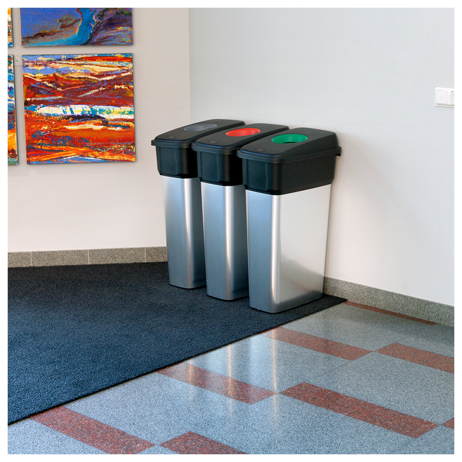 Для производства покрытия контейнеров ГЕО используется инновационная послойная технология, которая позволяет сочетать износостойкость и гибкость пластика с привлекательным внешним видом под металл. В результате контейнеры не подвергаются коррозии, на их поверхности не остаются отпечатки пальцев и вмятины, а благодаря инновационному дизайну они вписываются в самые современные интерьеры. Большой выбор крышек с цветовой кодировкой отвечает актуальным требованиям по раздельному сбору отходов.