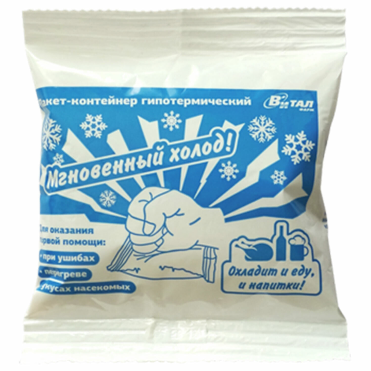 Пакет гипотермический охлаждающий ВИТАЛФАРМ Код товара: 631331 30,63 ₽ Купить Производитель:ВИТАЛФАРМ Пакет гипотермический охлаждающий ВИТАЛФАРМ предназначен для местного охлаждения и/или обезболивания. Показания: при травмах (переломах, ушибах, растяжении связок, вывихах), при тепловом или солнечном ударе, при ожогах (без повреждения кожных покровов), при несильных капиллярных или носовых кровотечениях, при подозрении на повреждения внутренних органов, при укусах насекомых. Изделие для однократного применения. Способ применения: 1. Расположить изделие на ровной поверхности. 2. Раздавить внутренний пакет с водой. 3. Встряхнуть для лучшего смешивания компонентов. 4. Приложить к пострадавшему месту. При использовании на лице или поврежденной коже обернуть дополнительно полиэтиленовой пленкой. Риски применения и меры предосторожности: При повреждении внешнего пакета изделие не использовать! Избегать попадания на кожу и слизистые! При попадании содержимого пакета на кожу или в глаза, промыть обильно водой. Беречь от детей! Не глотать! В случае проглатывания содержимого пакета, выпить большое количество воды, принять активированный уголь, при необходимости обратиться за врачебной помощью (показать врачу пакет).Производство: РоссияТип товара: Пакет гипотермическийНазначение: для первой помощиРазмер в разложенном виде: 11х14 смРазмер в сложенном виде: 11х14 смТолщина: 0 мкрКоличество в комплекте: 1 шт.Материал: полиэфирная пленкаВес нетто: 60 гЦвет: белыйСрок годности: 36 месВес: 59 грРазмер упаковки: 1.9 × 11.6 × 11.6 смОбъём: 0.0003 м3Промежуточная упаковка: 40 штТранспортная упаковка: 40 штШтрих-код: 4660043753118 Сертификат-1.jpg Сертификат-2.jpg Сертификат-3.jpg