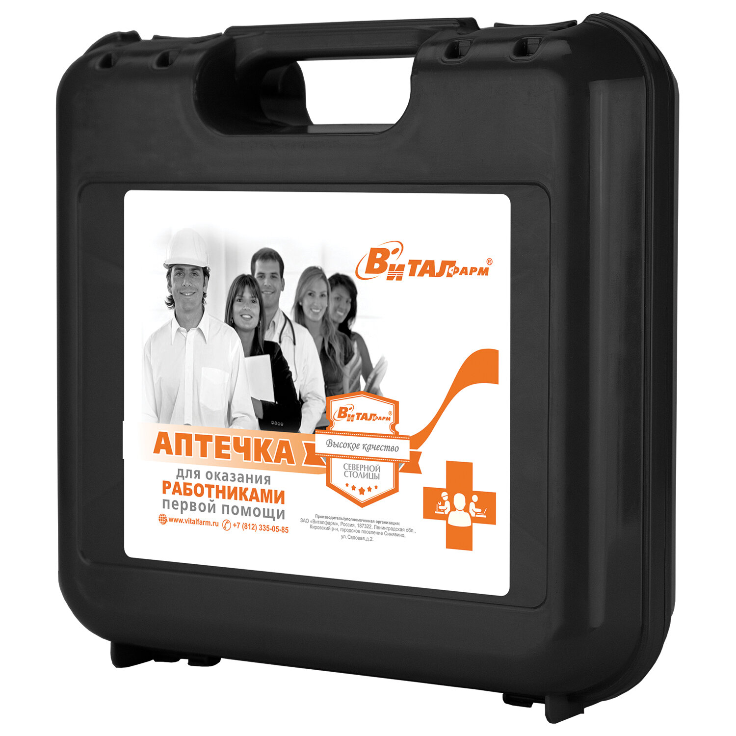 Аптечка первой помощи работникам, по приказу №262н, ВИТАЛФАРМ, пластиковый кейс Код товара: 631432 1 351,16 ₽ Купить Производитель:ВИТАЛФАРМ Аптечка первой помощи работникам ВИТАЛФАРМ в пластиковом переносном футляре (кейсе) рассчитана на оказание помощи пострадавшим вне медицинских учреждений. Изготовлена в соответствии с приказом Министерства здравоохранения РФ от 24.05.2024 г. №262н. Состав: 1. Маска медицинская нестерильная одноразовая (2 шт.). 2. Перчатки медицинские нестерильные, размером не менее М (2 пары). 3. Устройство для проведения искусственного дыхания "Рот-Устройство-Рот" (2 шт.). 4. Жгут кровоостанавливающий для остановки артериального кровотечения (1 шт.). 5. Бинт марлевый медицинский размером не менее 5 м х 10 см или бинт фиксирующий эластичный нестерильный размером не менее 2 м х 10 см (4 шт.) 6. Бинт марлевый медицинский размером не менее 7 м х 14 см или бинт фиксирующий эластичный нестерильный размером не менее 2 м х 14 см (4 шт.). 7. Салфетки медицинские стерильные №10 размером не менее 16х13 см (2 уп.). 8. Лейкопластырь фиксирующий рулонный размером не менее 2х500 см (1 шт.). 9. Лейкопластырь бактерицидный размером не менее 1,9х7,2 см (10 шт.). 10. Лейкопластырь бактерицидный размером не менее 4х10 см (2 шт.). 11. Покрывало спасательное изотермическое размером не менее 160х210 см (2 шт.). 12. Ножницы для разрезания перевязочного материала и ткани (1 шт.). 13. Инструкция по оказанию первой помощи с использованием аптечки для оказания работниками первой помощи пострадавшим с применением медицинских изделий (1 шт.). 14. Блокнот формата не менее А7 (1 шт.). 15. Маркер черный (синий) или карандаш (1 шт.). Внешний вид вложений и надписи на аптечке могут отличаться от фото на сайте.Производство: РоссияТип: коллективнаяНаполнение: по приказу 262нФорма выпуска: пластиковый чемоданчикСрок годности: 48 мес.Длина: 20.5 смШирина: 21 смГлубина: 6.5 смСрок годности: 48 месВес: 548 грРазмер упаковки: 6.2 × 20.9 × 20 смОбъём: 0.0036 м3Промежуточная упаковка: 24 штТранспортная упаковка: 24 штШтрих-код: 4660043754061 Сертификат-1.jpg Сертификат-2.jpg Сертификат-3.jpg