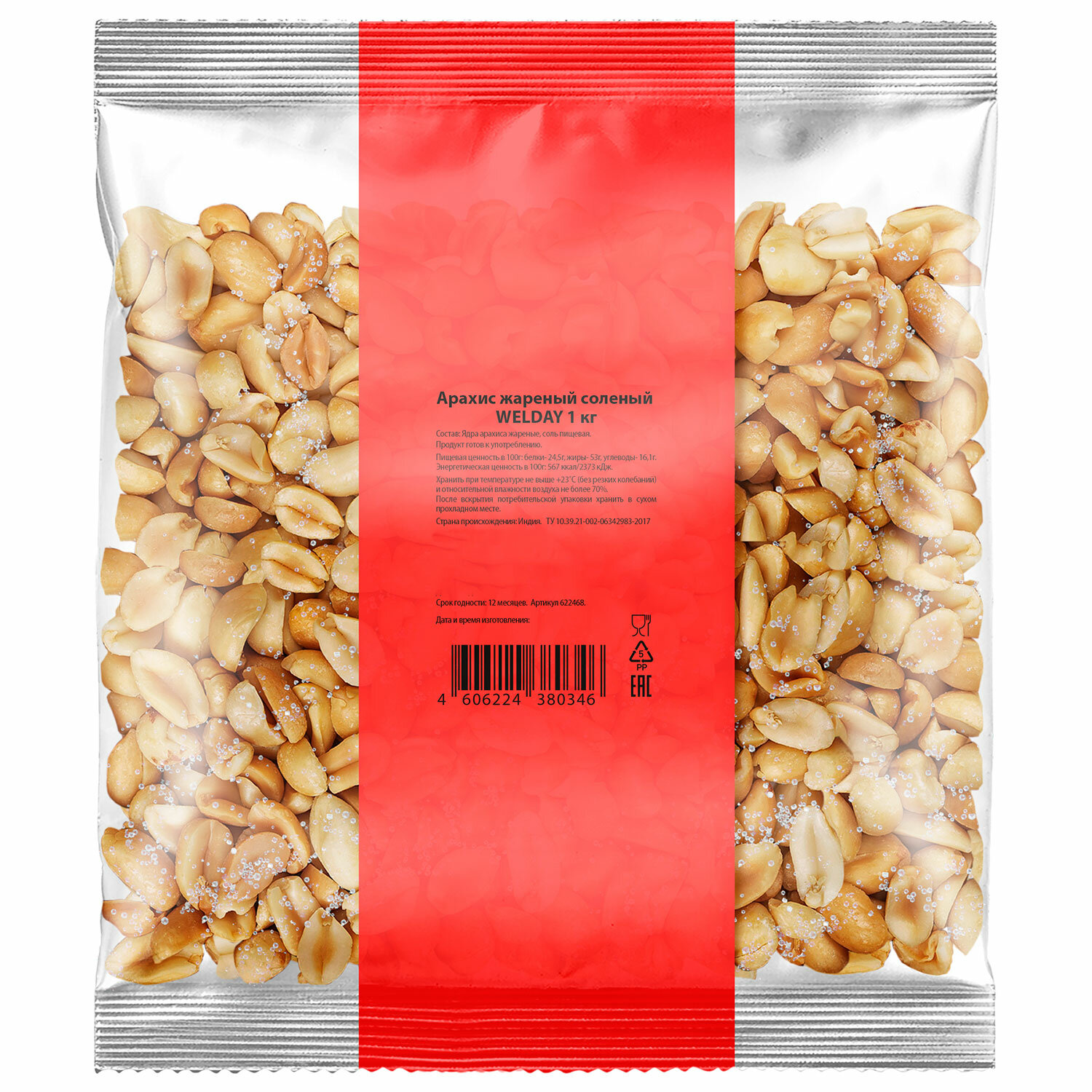 Арахис жареный соленый WELDAY (ВЭЛДЭЙ) 1 кг Код товара: 622468 481,25 ₽ Купить Производитель:WELDAY Орехи и сухофрукты являются богатым источником энергии для нашего организма, содержат много полезных питательных веществ и витаминов. Их можно использовать как полезный и вкусный перекус в течение рабочего дня. Обжаренный арахис сохраняет все содержащиеся в нем полезные вещества и легко усваивается организмом. В состав арахиса входят витамины группы В, Е, С, минералы магний, кальций, железо, натрий, цинк, антиоксиданты, ненасыщенные жирные кислоты, растительный белок и клетчатка. Благодаря обжарке в арахисе увеличивается количество важного антиоксиданта полифенола. Состав: арахис обжаренный, соль пищевая. Страна происхождения – Бразилия. Вес – 1 кг. Упаковка – прозрачный пакет из полипропилена. Условия хранения: при температуре не более +25°C и относительной влажности не более 75%. Срок годности – 12 месяцев.Производство: РоссияТип продукта: арахисВес нетто: 1000 гОсобенности: жареные, соленыеВкус: арахисТип упаковки: пакетСрок годности: 12 мес.Фирма-производитель: АЗИЯ-ФУДСрок годности: 12 месВес: 1,05 кгРазмер упаковки: 6.2 × 18.3 × 17.3 смОбъём: 0.0028 м3Промежуточная упаковка: 8 штТранспортная упаковка: 8 штШтрих-код: 4606224380346 Сертификат-1.jpg Сертификат-2.jpg Сертификат-3.jpg