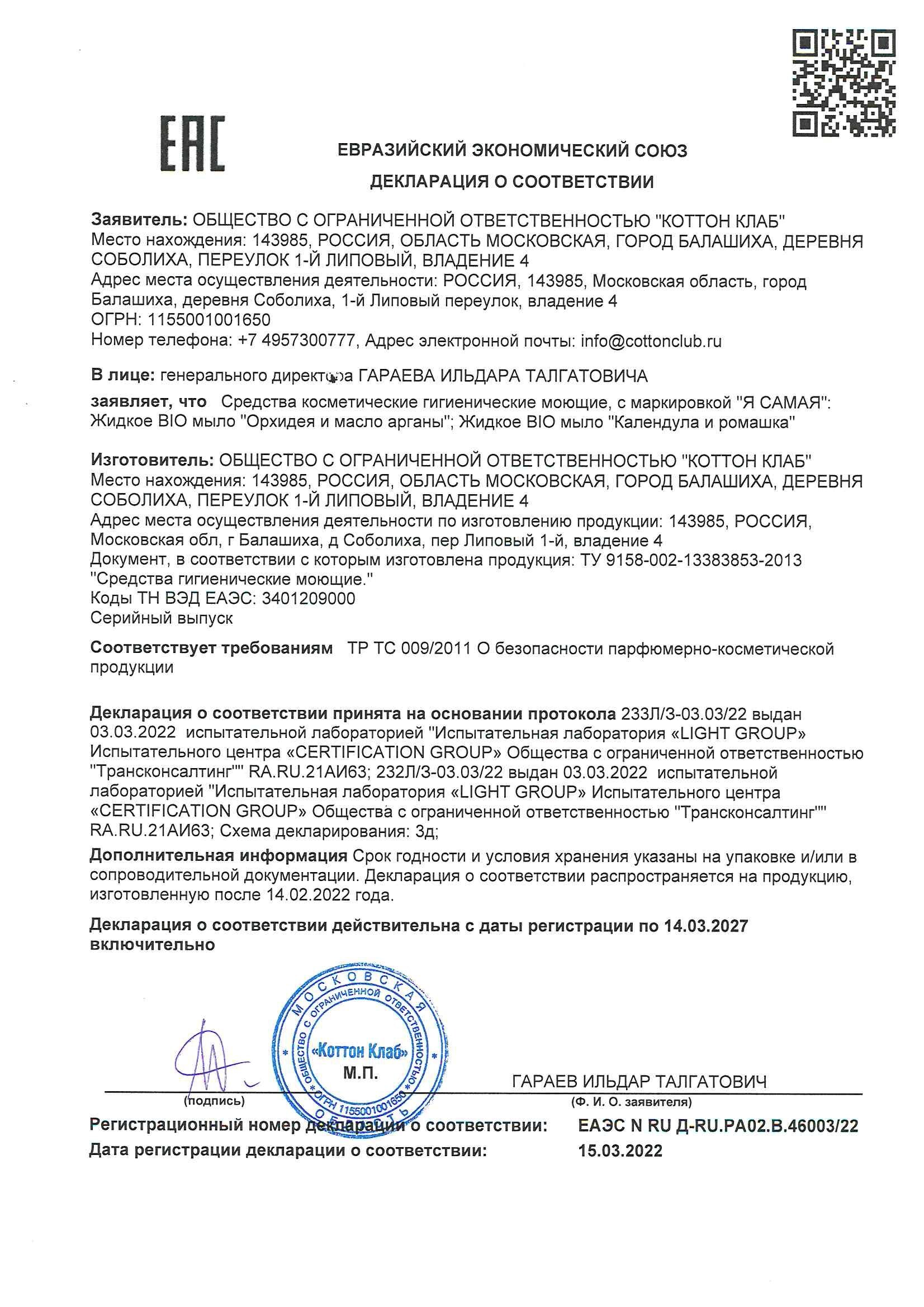 Мыло-крем жидкое, 500 мл, Я САМАЯ BIO, "Календула и ромашка", упаковка дой-пак, для дозаторов Код товара: 602888 131,31 ₽ Купить Производитель:Я САМАЯ Мыло Я САМАЯ BIO восстанавливает, защищает и мягко очищает, бережно ухаживает за кожей рук. Экстракты календулы и ромашки оказывают антисептическое действие, интенсивно увлажняют и смягчают кожу, снимают раздражение и способствуют восстановлению. В основе средства лежит смесь очищающих и увлажняющих добавок, которые придают ощущение чистоты и свежести, не вызывая сухости кожи. Способ применения: небольшое количество мыла нанести на влажную кожу, вспенить и смыть водой.Производство: РоссияОбъем / Вес: 500 мл/гМыло-крем: даПодходящий тип кожи: для всех типовЭффект от использования: очищение, увлажнениеСерия: BIOОтдушка: календула и ромашкаСбалансированный уровень рН: даТип дозирования: нетВид упаковки: дой-пакЦвет: жёлтыйСрок годности: 36 месРазмер упаковки: 20.3 × 12.9 × 6.8 смОбъём: 0.0016 м3Промежуточная упаковка: 12 штТранспортная упаковка: 12 штШтрих-код: 4600999011573 Сертификат-1.jpg Сертификат-2.jpg Сертификат-3.jpg