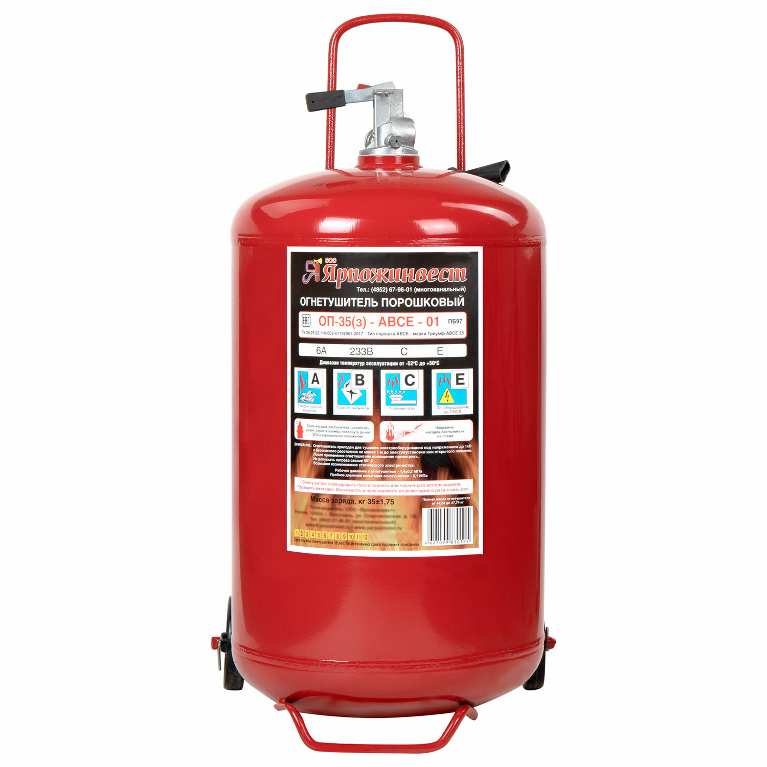 Огнетушитель порошковый ОП-35, ПЕРЕДВИЖНОЙ, АВСЕ (твердые, жидкие, газообразные, электроустановки), ЯРПОЖ Код товара: 611016 6 031,89 ₽ Купить Производитель:Ярпожинвест Порошковый огнетушитель ЯРПОЖ предназначен для оперативного устранения очага возгорания. Мелкодисперсная минеральная пыль огнетушащего порошка перекрывает доступ кислорода, практически моментально прекращая процесс горения. Огнетушитель порошковый ОП-35 (з) применяется при борьбе с очагами возгорания АВСЕ-классов на больших территориях, обладающих повышенной пожароопасностью. Масса заряда – 42,5 кг, шланг – 3 метра. Рекомендуемый температурный диапазон эксплуатации составляет от -50 до +50 °С. К территориям возможного применения относятся: • предприятия газо- и нефтеперерабатывающих отраслей, • предприятия химической промышленности, • склады горючесмазочных материалов, • территории автосервисов; • гаражные хозяйства, • строительные базы, • автозаправочные станции (включая АГЗС), • стоянки автомобилей. Огнетушитель обладает конструкцией, включающей корпус с огнетушащим веществом. На горловине находится запорно-пусковое устройство с индикатором давления и ручкой для управления подачей порошка. Для удобства транспортировки предусмотрена дополнительная ручка. Устройство оборудовано рукавом с распылителем, что позволяет получать факел распыла порошка. Огнетушитель оснащен чекой для предотвращения самосрабатывания. При комплектации объекта огнетушителем порошковым ОП-35 (з) АВСЕ необходимо учитывать нормы оснащения передвижными огнетушителями (Приложение №2 Правил противопожарного режима в РФ) для определения количества и применимости данного типа огнетушителей.Производство: РоссияТип огнетушащего вещества: порошокМесто использования: в помещении, на улицеОгнетушащая способность: 6А 233В СЕ (электроустановки под напряжением до 1000 В)Передвижной: даВид пускового устройства: пистолетного типаМасса огнетушащего вещества: 35 кгСоответствует требованиям ГОСТа: ГОСТ 51017-2009Высота: 750 ммДиаметр: 310 ммСрок службы: 10 летМасса не более: 49.8 кгИндивидуальная упаковка: даВес: 43,88 кгРазмер упаковки: 70.5 × 33 × 37 смОбъём: 0.0861 м3Промежуточная упаковка: 1 штТранспортная упаковка: 1 штШтрих-код: 4627099830125 Файлы Приложение-1.pdf Сертификат-1.jpg Сертификат-2.jpg Сертификат-3.jpg