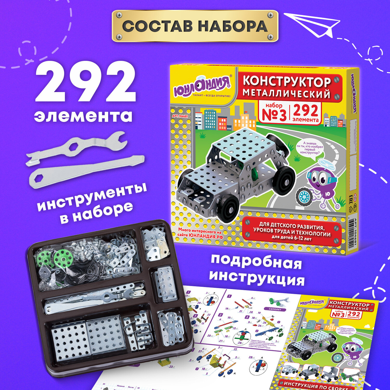 Конструктор металлический ЮНЛАНДИЯ "Для уроков труда №3", развивающий, 292 элемента Код товара: 104681 869,01 ₽ Купить Производитель:ЮНЛАНДИЯ Металлический конструктор ЮНЛАНДИЯ позволяет ребенку в игре развивать логическое и абстрактное мышление, мелкую моторику рук, внимательность и фантазию. Прекрасно подходит для уроков труда в школе. В комплект входят 292 элемента, среди которых есть подвижные детали, позволяющие собрать бесчисленное количество моделей. Комплектация: детали – 290 шт., ключ гаечный – 1 шт., отвертка – 1 шт., инструкция по сборке. Для удобства в набор входит подробная иллюстрированная инструкция с пошаговыми рекомендациями по сборке 5 разных моделей, которая познакомит начинающего мастера с азами сборки. Начальный уровень сложности сборки предусмотрен для детей младшего и среднего школьного возраста. Элементы конструктора выполнены из металла и пластика. Также в набор входят пластиковые детали. Поставляется в картонной упаковке.Производство: РоссияТип товара: конструкторСерия: Для уроков трудаМатериал: металл, пластикНаличие подвижных деталей: даУровень сложности сборки: начальныйРекомендуемый возраст: от 6 летТип деталей: разные формыСюжет: ТранспортКоличество элементов: 292 шт.Количество моделей для сборки: 5Комплектация: инструкция по сборкеЦвет: ассортиУпаковка: картонная коробкаВес: 725 грРазмер упаковки: 3.9 × 23.2 × 20.6 смОбъём: 0.0024 м3Промежуточная упаковка: 10 штТранспортная упаковка: 10 штШтрих-код: 4606224182520 Сертификат-1.jpg Сертификат-2.jpg Сертификат-3.jpg