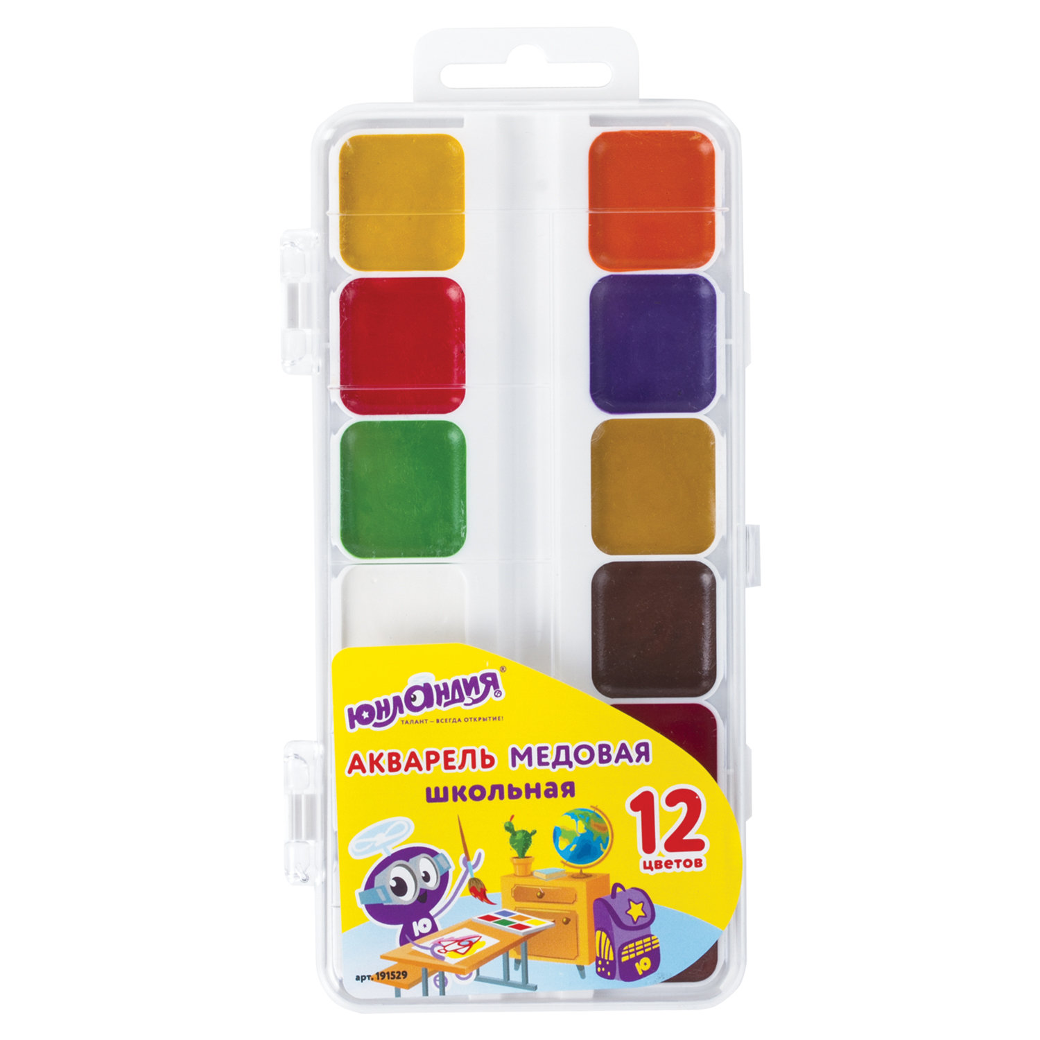 Краски акварельные ЮНЛАНДИЯ "ШКОЛЬНЫЕ", медовые, 12 цветов, КЛАССИЧЕСКИЕ, пластик Код товара: 191529 96,23 ₽ Купить Производитель:ЮНЛАНДИЯ Акварельные краски ЮНЛАНДИЯ идеально подходят для уроков детского творчества и художественного изобразительного искусства. Рисование способствует развитию образного мышления, глазомера, мелкой моторики рук, тонкому восприятию цветовой гаммы. 12 ярких насыщенных цветов отлично смешиваются между собой и позволяют создать множество оттенков, обеспечивают однородное окрашивание. Краски быстро высыхают и не портятся со временем. Безопасны для детей, нетоксичны. Выпускаются в пластиковом пенале с прозрачной крышкой, квадратной формой кювет и отделением для кисточки. Упаковка обладает компактными размерами и легким весом.Производство: РоссияКоличество цветов в наборе: 12 шт.Добавка в основу: мёдОтделение для кисточки: даФорма кювет: квадратнаяСерия: ШкольныеУпаковка: пластиковая коробкаВес: 102 грРазмер упаковки: 1.7 × 18.7 × 8.8 смОбъём: 0.0004 м3Промежуточная упаковка: 12 штТранспортная упаковка: 12 штШтрих-код: 4606224225081 Сертификат-1.jpg Сертификат-2.jpg Сертификат-3.jpg