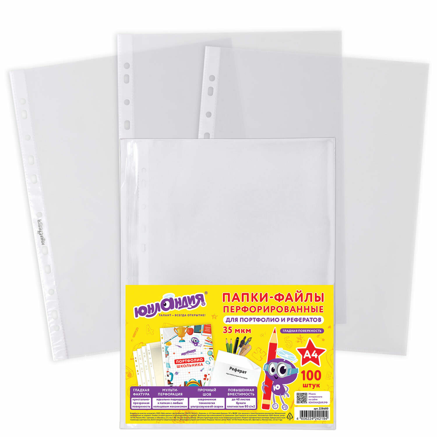 Папки-файлы перфорированные А4 ЮНЛАНДИЯ, КОМПЛЕКТ 100 шт., гладкие, 35 мкм Код товара: 228680 487,59 ₽ Купить Производитель:ЮНЛАНДИЯ Перфорированные папки-файлы ЮНЛАНДИЯ предназначены для хранения документов в папке с любым кольцевым механизмом или скоросшивателем. Перфопапки формата А4 с вертикальным размещением содержат универсальную перфорацию, а также имеют гладкую поверхность и прочные швы. Файлы являются незаменимым атрибутом в офисе, позволяют систематизировать документы и обеспечивают их сохранность на долгое время. Изготовлены из пленки толщиной 35 мкм. В комплект входит 100 перфопапок.Производство: РоссияФормат: А4Количество в комплекте: 100 шт.Толщина пленки: 35 мкмОриентация: вертикальнаяФактура: гладкаяЦвет: прозрачныйВес: 433 грРазмер упаковки: 1.4 × 31.4 × 25 смОбъём: 0.0008 м3Промежуточная упаковка: 20 штТранспортная упаковка: 20 штШтрих-код: 4606224242194 Файлы Сертификат-1.jpg Сертификат-2.jpg Сертификат-3.jpg Сертификат-4.jpg