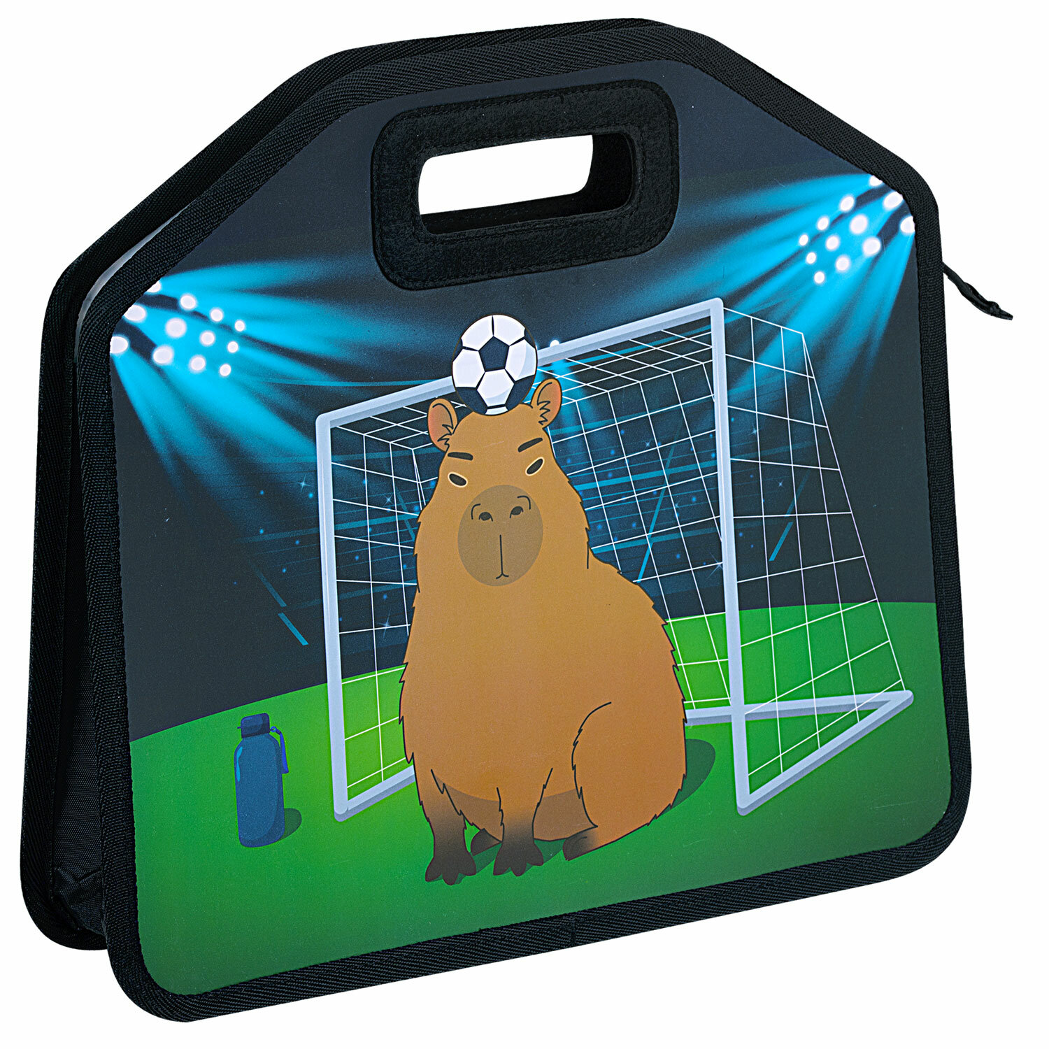 Папка-сумка ЮНЛАНДИЯ, 1 отделение, фетровые ручки, 34х30х11 см, Capyball Код товара: 272207 380,2 ₽ Купить Производитель:ЮНЛАНДИЯ Папка-сумка на молнии с ручками ЮНЛАНДИЯ выполнена из пластика, имеет уплотненные фетром двойные ручки в корпусе, по по краям окантована тканью. Застежка-молния расположена по верхнему краю папки. Практичная широкая папка-сумка на молнии защитит содержимое от замятий и повреждений. Яркая и четкая печать дизайна с двух сторон папки. Застегивается на молнию по верхнему краю. Двойные фетровые ручки способствуют комфортной переноске при большой нагрузке. Прорезиненный материал на дне и по бокам папки создает водонепроницаемый эффект. Размер – 34х30 см, глубина – 11 см. Широкий формат товара позволяет разместить большое количество канцелярских принадлежностей для творчества внутри, в том числе стакан-непроливайку и листы формата А4. Индивидуальная упаковка – полиэтиленовый пакет с европодвесом – сохраняет товар при транспортировке и позволяет удобно разместить его для клиента.Производство: КитайТип товара: папка-сумкаСерия: CARRIERФормат: А4Пол ребенка: для мальчиковКоличество отделений: 1Дизайн: CapyballЗастежка: молнияРучки: в корпусе папкиТолщина пластика: 0.5 ммТканевая окантовка: даЦветная печать: даМатериал: пластикДлина: 340 ммШирина: 300 ммГлубина: 110 ммЦвет: черныйВес: 260 грРазмер упаковки: 34 × 30 × 2 смОбъём: 0.0012 м3Промежуточная упаковка: 24 штТранспортная упаковка: 48 штШтрих-код: 4606224430744 Сертификат-1.jpg Сертификат-2.jpg Сертификат-3.jpg