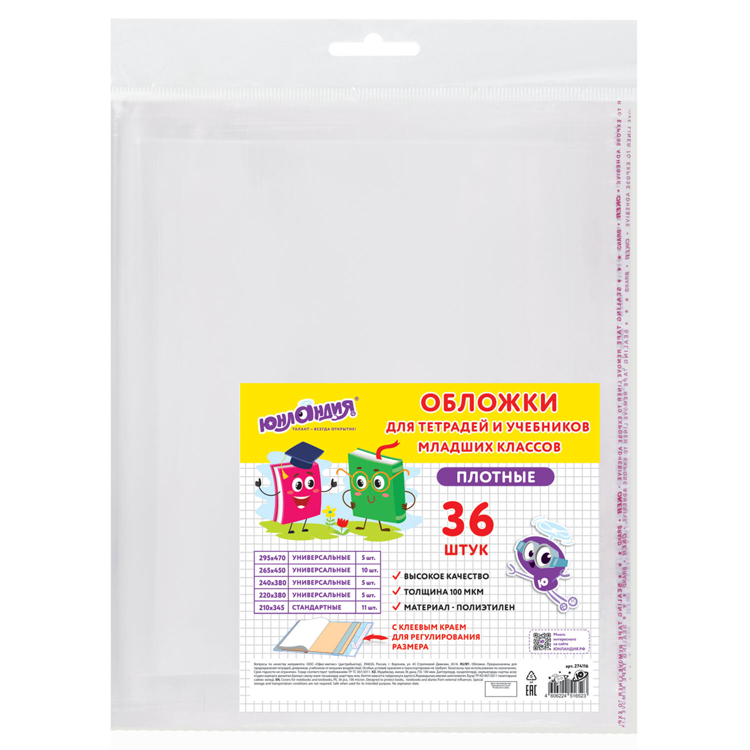 Обложки ПЭ для тетрадей и учебников младших классов, НАБОР 36шт, КЛЕЙКИЙ КРАЙ, 110 мкм, ПЛОТНЫЕ, универсальные, прозрачные, ЮНЛАНДИЯ Код товара: 274116 446,25 ₽ Купить Производитель:ЮНЛАНДИЯ Прозрачные обложки ЮНЛАНДИЯ отлично предохраняют тетради и учебники от внешних воздействий, тем самым увеличивая срок их службы и сохраняя прекрасный внешний вид. Предназначены для тетрадей и учебников младших классов. Прозрачные плотные обложки ЮНЛАНДИЯ для тетрадей и учебников начальных классов изготовлены из полиэтилена (ПЭ), толщиной 110 мкм. Благодаря КЛЕЙКОМУ КРАЮ обложка легко регулируется по ширине. В наборе следующие обложки: • 295х470 мм – 5 шт., • 265х450 мм – 10 шт., • 240х380 мм – 5 шт., • 220х380 мм – 5 шт., • 210х345 мм – 11 шт.Производство: РоссияПредназначены для: дневников, прописей, рабочих тетрадей, тетрадей, тетрадей А4, учебниковРазмер: 210х345 ммКоличество в комплекте: 36 шт.Регулировка ширины: даМатериал: ПЭТолщина: 110 мкмТип обложки: глянцеваяНаличие клеевого края: даЦвет: прозрачныйНаличие штрихкода на ед. товара: даВес: 459 грРазмер упаковки: 1.8 × 29.2 × 25.3 смОбъём: 0.0009 м3Промежуточная упаковка: 20 штТранспортная упаковка: 20 штШтрих-код: 4606224516523 Сертификат-1.jpg Сертификат-2.jpg Сертификат-3.jpg