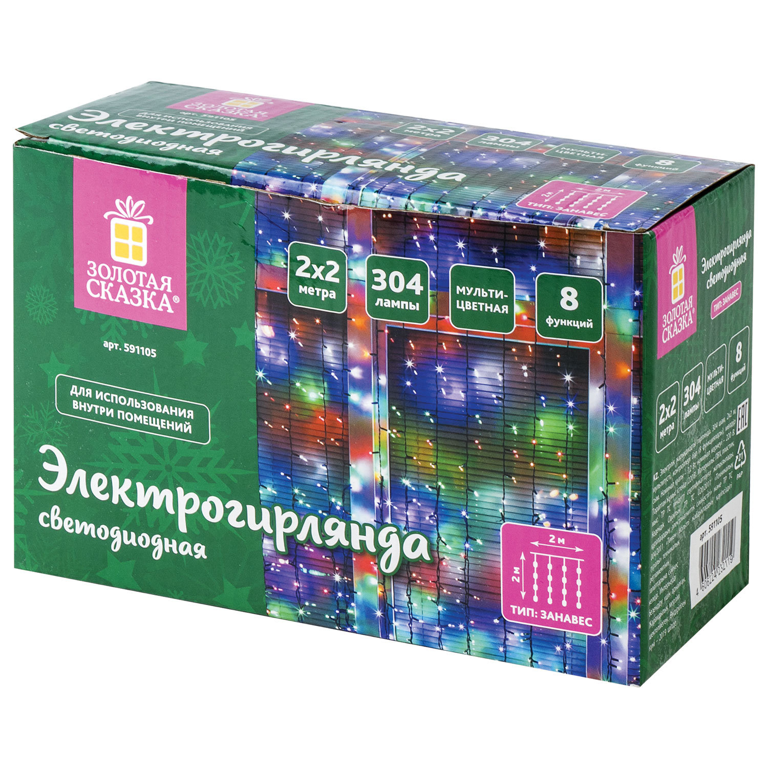 Электрогирлянда-занавес комнатная "Штора" 2х2 м, 304 LED, мультицветная, 220 V, контроллер, ЗОЛОТАЯ СКАЗКА Ликвидация Код товара: 591105 823,33 ₽ Купить Производитель:ЗОЛОТАЯ СКАЗКА Электрогирлянда типа "Занавес" позволит украсить окна или интерьер внутри помещения и привнести праздничное настроение вместе с яркими цветами гирлянды. Контроллер позволяет настроить свечение гирлянды по своему вкусу. Светодиодные гирлянды – это яркие, красочные и эффектные спутники любого праздничного события. Мягкий и вместе с тем насыщенный свет этих украшений позволяет использовать их как для придания магического и праздничного свечения улицам города и фасадам зданий, так для светового декорирования интерьеров домов, административных и развлекательных учреждений.Зажигание огней в домах и на улицах во время зимних праздников – одна из их главных традиций. Новогодние гирлянды – современная интерпретация свечей, которыми украшались дома раньше.Основными достоинствами таких устройств являются: - яркость; - экономный расход электроэнергии; - износостойкость; - пожаробезопасность.Лампы сделаны на основе технологии LED, которая является более безопасной и эффективной по сравнению с лампой накаливания.Производство: КитайИспользование: помещениеТип электрогирлянды: Занавес "Штора"Количество режимов: 8Наличие контроллера: даДлина: 2 мШирина: 2 мМощность: 7.2 ВтКоличество ламп: 304 шт.Тип ламп: светодиоднаяФорма ламп/фигуры: цилиндрЦвет ламп: мультицветныйЦвет провода: прозрачныйПитание: сетьУпаковка единицы товара: картонная коробкаВес: 409 грРазмер упаковки: 8.1 × 18.1 × 12 смОбъём: 0.0021 м3Промежуточная упаковка: 24 штТранспортная упаковка: 24 штШтрих-код: 4606224232119 Файлы Сертификат-1.jpg Сертификат-2.jpg Сертификат-3.jpg Сертификат-4.jpg Сертификат-5.jpg Сертификат-6.jpg