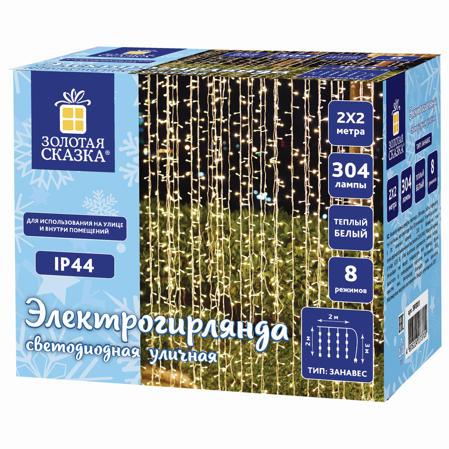 Электрогирлянда-занавес уличная "Штора" 2х2 м, 304 LED, теплый белый, 220 V, контроллер, ЗОЛОТАЯ СКАЗКА Ликвидация Код товара: 591301 1 345,68 ₽ Купить Производитель:ЗОЛОТАЯ СКАЗКА Электрогирлянда уличная ЗОЛОТАЯ СКАЗКА позволит как создать праздничную атмосферу вне помещений, например, украсить фасад зданий, так и украсить внутренний интерьер помещений. Электрическая светодиодная гирлянда представляет собой светодиоды, соединенные между собой электрическим проводом. Тип конструкции электрогирлянды - "Занавес". Данный тип конструкции предусматривает наличие основного провода рабочей части электрогирлянды без светодиодов, к которому перпендикулярно присоединены 16 нитей длиной 2 м по 19 светодиодов на каждой. Длина основного провода рабочей части гирлянды составляет 2 м, длина силового кабеля (кабеля питания) - 3 м. Количество светодиодов - 304 шт. Конструкцией гирлянды предусмотрено наличие контроллера для принудительного переключения между режимами свечения. Количество режимов свечения - 8 шт. Цвет свечения гирлянды - теплый белый. Гирлянда работает от сети. Номинальное напряжение электрической цепи гирлянды составляет 220 В. Электрогирлянда имеет высокую степень влагозащиты и защиты от пыли (IP44), поэтому допускается использование вне помещений.Производство: КитайИспользование: помещение, улицаТип электрогирлянды: Занавес "Штора"Количество режимов: 8Наличие контроллера: даДлина: 2 мШирина: 2 мМощность: 6 ВтКоличество ламп: 304 шт.Тип ламп: светодиоднаяФорма ламп/фигуры: цилиндрЦвет ламп: теплый белыйЦвет провода: серебристыйПитание: сетьУпаковка единицы товара: картонная коробкаВес: 454 грРазмер упаковки: 10 × 16.9 × 14 смОбъём: 0.0029 м3Промежуточная упаковка: 24 штТранспортная упаковка: 24 штШтрих-код: 4606224273709 Файлы Сертификат-1.jpg Сертификат-2.jpg Сертификат-3.jpg Сертификат-4.jpg Сертификат-5.jpg Сертификат-6.jpg