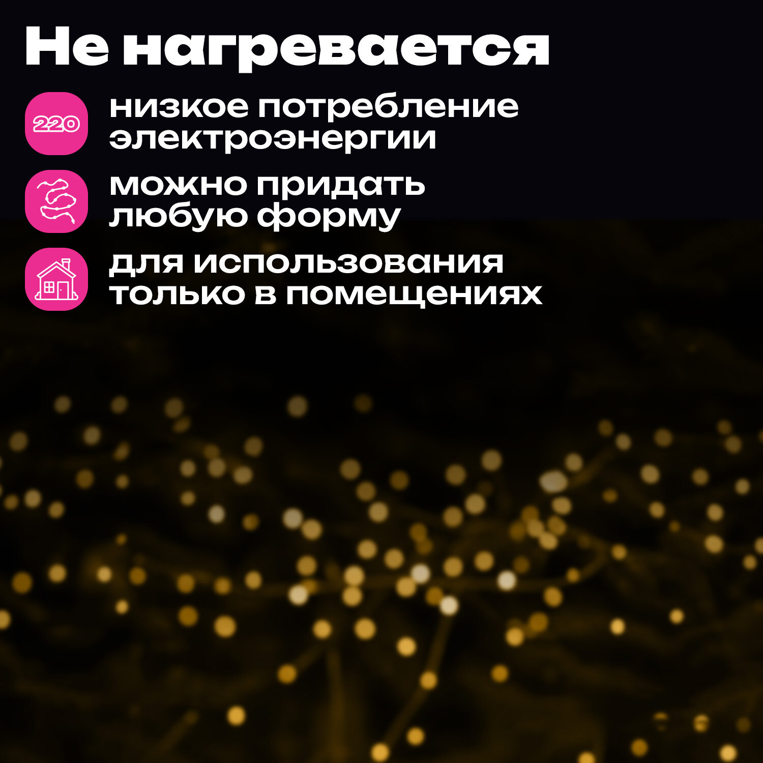 Электрогирлянда-нить комнатная "Стандарт" 10 м, 100 LED, теплый белый свет, 220 V, контроллер, ЗОЛОТАЯ СКАЗКА Код товара: 591346 217,82 ₽ Купить Производитель:ЗОЛОТАЯ СКАЗКА Самая популярная и универсальная модель электрогирлянды, которой можно украсить как новогоднюю ель, так и интерьер. Мягкий, но вместе с тем насыщенный свет этой гирлянды создаст уютное свечение внутри помещения. Электрическая светодиодная гирлянда представляет собой светодиоды, соединенные электрическим проводом. Тип конструкции - "Нить". Длина рабочей части гирлянды составляет 10 м. Количество светодиодных ламп - 100 шт. Лампы сделаны на основе технологии LED, которая является более безопасной и эффективной по сравнению с лампой накаливания. Конструкцией гирлянды предусмотрено наличие контроллера для того, чтобы настроить свечение гирлянды по своему вкусу. Количество режимов свечения - 8 шт. Цвет свечения гирлянды - теплый белый. Гирлянда работает от сети. Номинальное напряжение электрической цепи гирлянды составляет 220 В. Длина кабеля питания - 0,7 м. Тип используемой штепсельной вилки для соединения с источником питания - europlug (CEE 7/16). Допускается использование только внутри помещений.Производство: КитайИспользование: помещениеТип электрогирлянды: Нить комнатная "Стандарт"Количество режимов: 8Наличие контроллера: даДлина: 10 мМощность: 4 ВтКоличество ламп: 100 шт.Тип ламп: светодиоднаяФорма ламп/фигуры: цилиндрЦвет ламп: теплый белыйЦвет провода: черныйПитание: сетьУпаковка единицы товара: картонная коробкаВес: 188 грРазмер упаковки: 6.9 × 12.7 × 8 смОбъём: 0.0009 м3Промежуточная упаковка: 48 штТранспортная упаковка: 48 штШтрих-код: 4606224404394 Файлы Сертификат-1.jpg Сертификат-2.jpg Сертификат-3.jpg Сертификат-4.jpg Сертификат-5.jpg Сертификат-6.jpg