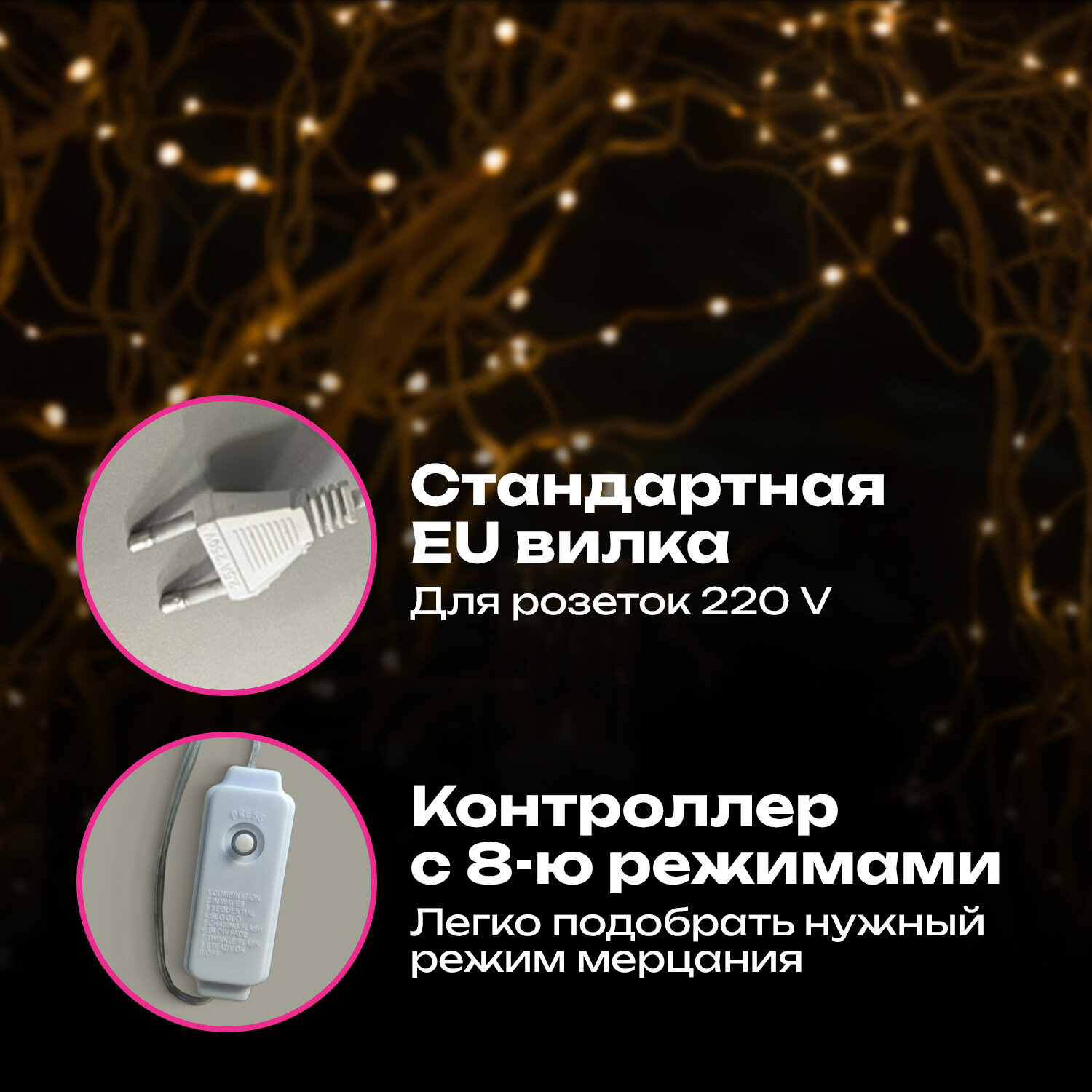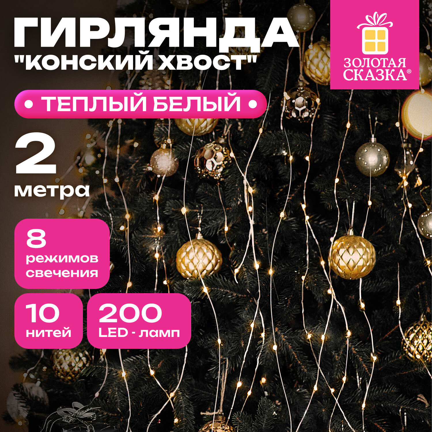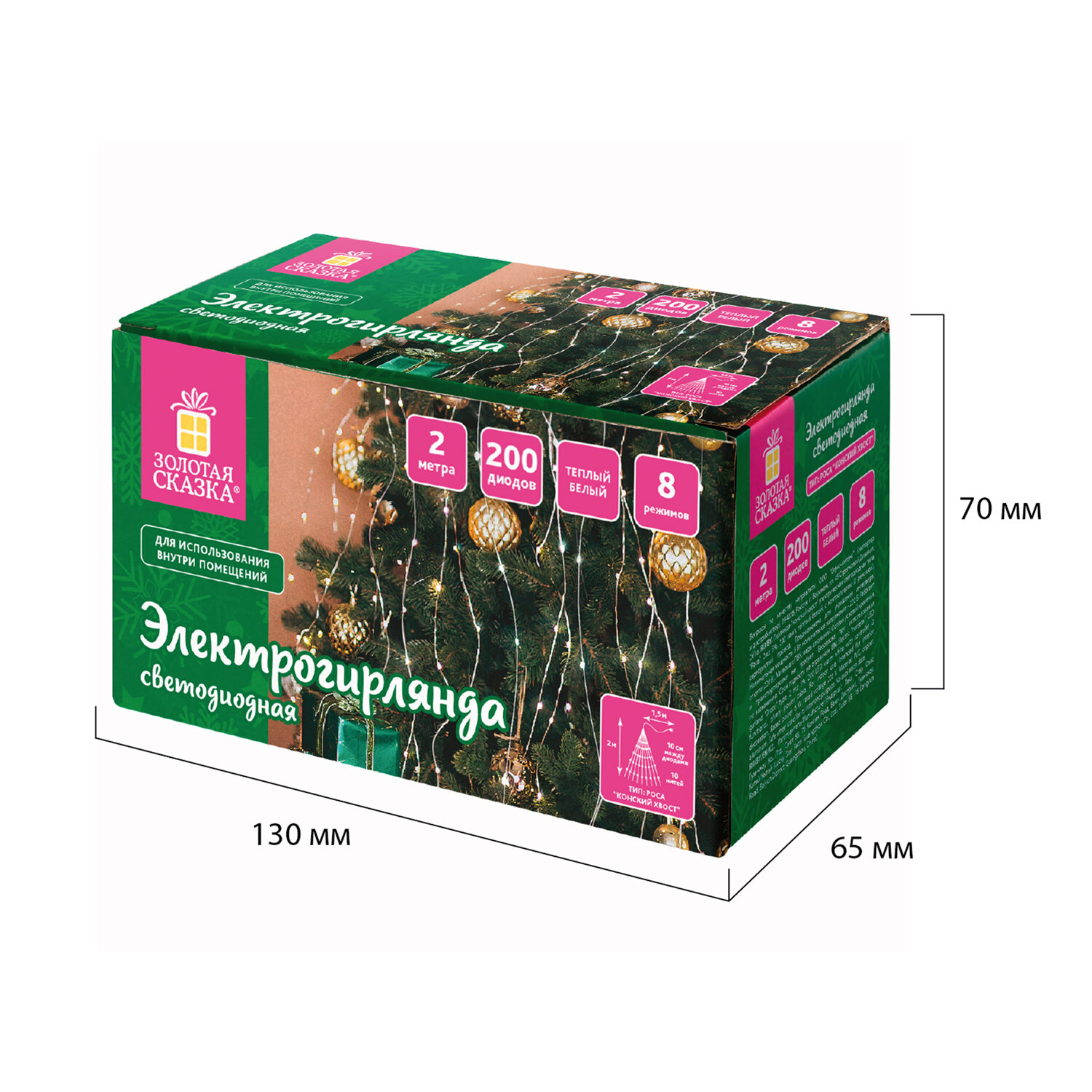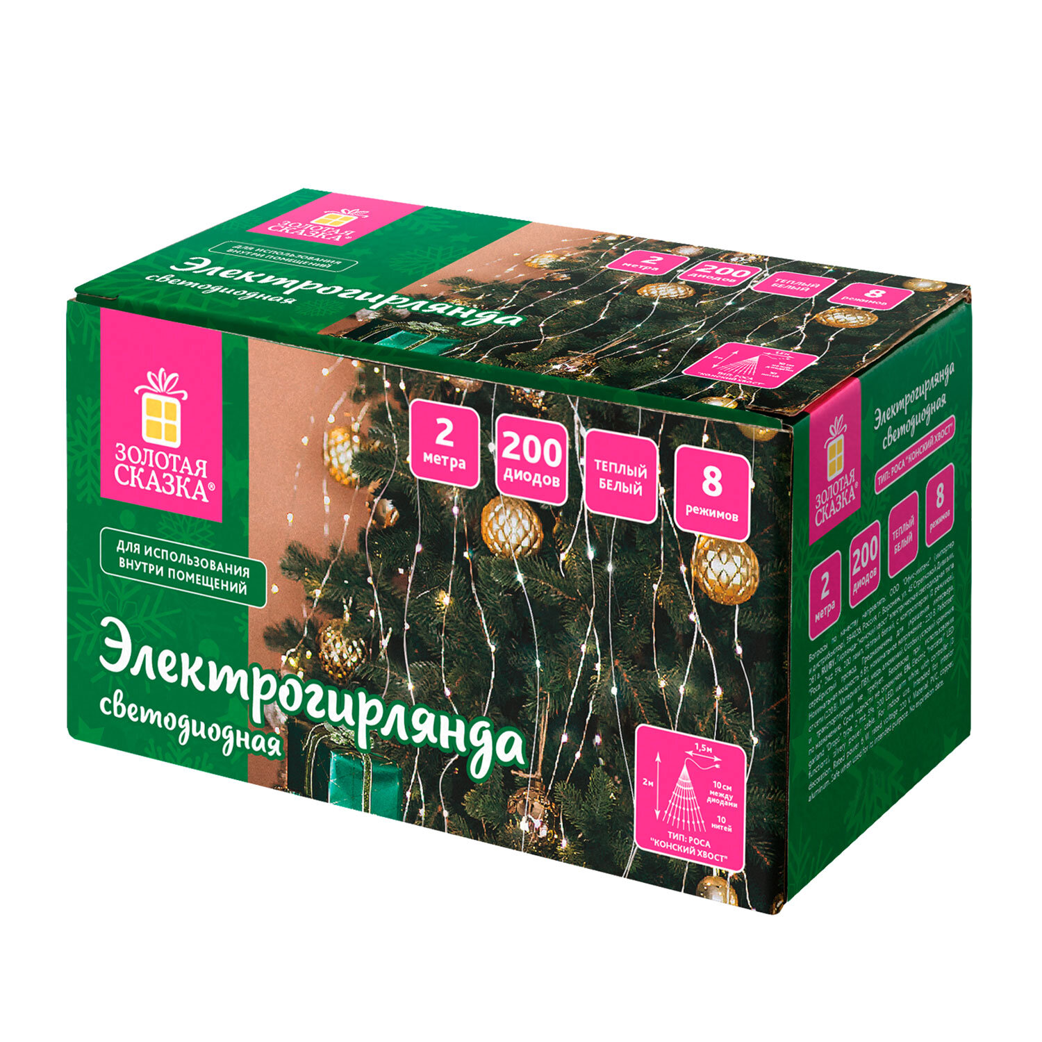 Электрогирлянда-конский хвост комнатная, 2 м, 200 LED, тёплый белый, 220 V, ЗОЛОТАЯ СКАЗКА Код товара: 591365 563,4 ₽ Купить Производитель:ЗОЛОТАЯ СКАЗКА Гирлянда "Конский хвост" ЗОЛОТАЯ СКАЗКА – это великолепное украшение для Вашей новогодней ели, которое добавит уникальный шарм и волшебство в праздничную атмосферу! Гирлянда "Конский хвост" представляет собой 10 светодиодных нитей, которые связаны между собой в пучок и закреплены в пластиковый держатель. Длина гирлянды, составляющая 2 метра, позволяет одной гирляндой украсить всю ёлку быстро и стильно. Светодиодные лампы (200 шт.), сделаны на основе технологии LED, которая является более безопасной и эффективной по сравнению с лампой накаливания. Расстояние между светодиодами – 10 см. Цвет свечения гирлянды – тёплый белый. Конструкцией гирлянды предусмотрено наличие контроллера для принудительного переключения между режимами свечения. Количество режимов свечения – 8 шт. Прибор работает от сети. Номинальное напряжение электрической цепи гирлянды составляет 220 V. Тип используемой штепсельной вилки для соединения с источником питания – europlug (CEE 7/4). Данный тип вилки рассчитан на напряжение до 220 V. Допускается использование только внутри помещений.Производство: КитайИспользование: помещениеТип электрогирлянды: "Конский хвост"Количество режимов: 8Наличие контроллера: даДлина: 2 мМощность: 6 ВтКоличество ламп: 200 шт.Тип ламп: светодиоднаяФорма ламп/фигуры: капляЦвет ламп: теплый белыйЦвет провода: серебристыйПитание: сеть, 220 ВУпаковка единицы товара: картонная коробкаВес: 121 грРазмер упаковки: 6.8 × 13 × 7 смОбъём: 0.0008 м3Промежуточная упаковка: 20 штТранспортная упаковка: 20 штШтрих-код: 4606224511252 Файлы Сертификат-1.jpg Сертификат-2.jpg Сертификат-3.jpg Сертификат-4.jpg Сертификат-5.jpg Сертификат-6.jpg Сертификат-7.jpg
