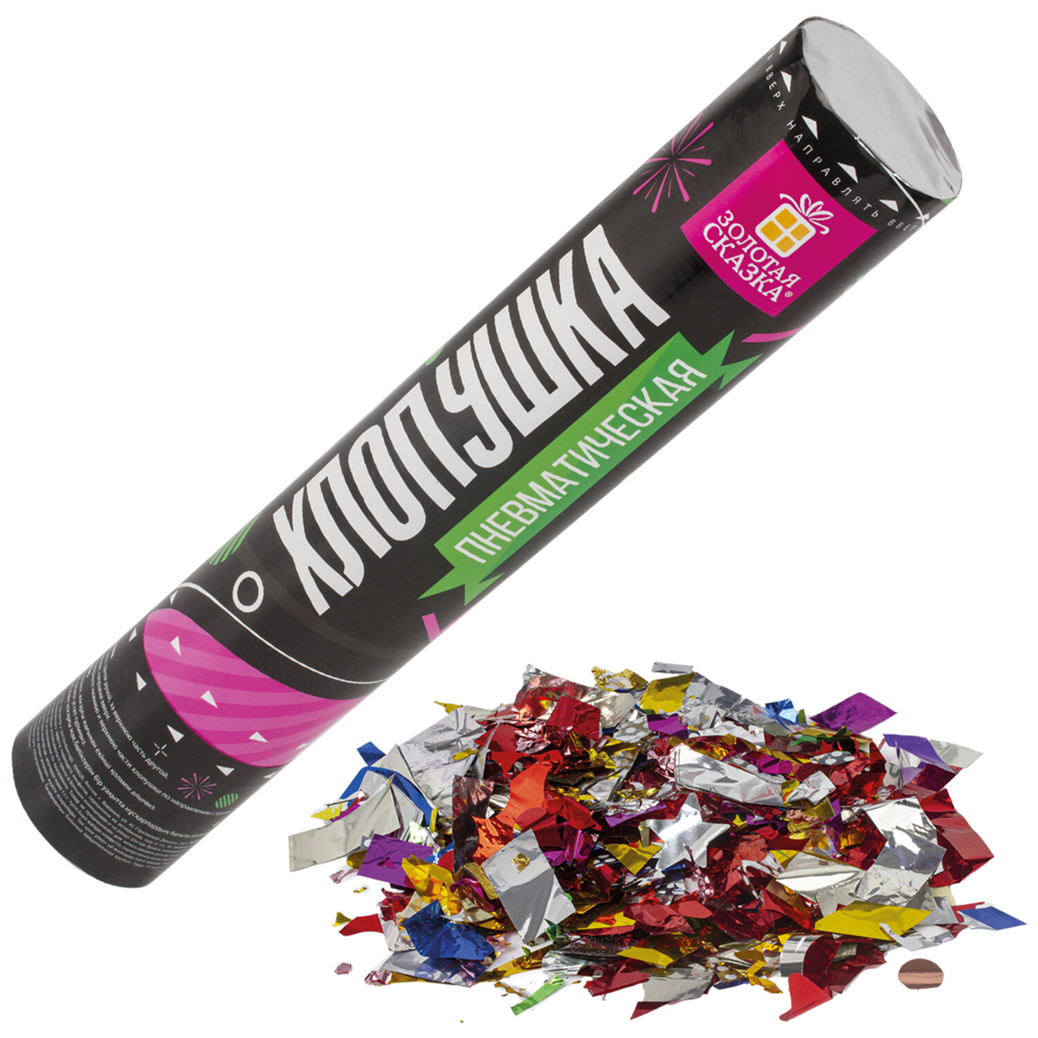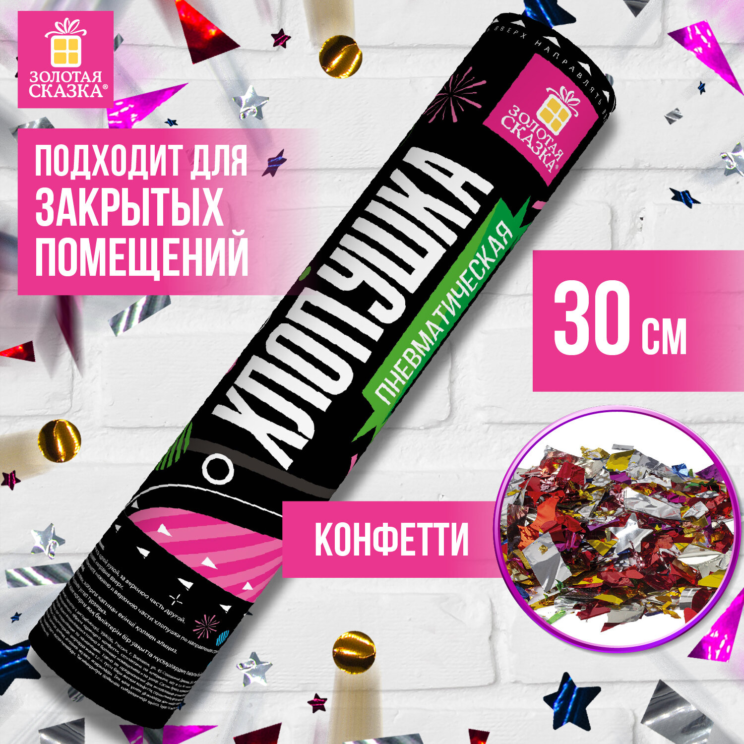 Хлопушка пневматическая ЗОЛОТАЯ СКАЗКА 30 см, фольга, конфетти, ассорти Код товара: 591473 112,61 ₽ Купить Производитель:ЗОЛОТАЯ СКАЗКА Пневматическая хлопушка ЗОЛОТАЯ СКАЗКА предназначена для создания отличного настроения и атмосферы настоящего веселья на любом празднике - новогодней вечеринке, торжестве в честь Дня Рождения, выпускном, корпоративе или любом другом праздничном событии. Хлопушка высотой 30 см с фольгированным наполнителем в виде конфетти цвета ассорти является абсолютно безопасной. Выстрел осуществляется под действием сжатого воздуха. Не является пиротехникой. Средняя дальность выстрела – 5-7 м. Корпус хлопушки состоит из двух частей: пневматического баллона со сжатым воздухом и картонного цилиндра с наполнителем. Рекомендуется использовать хлопушку внутри больших помещений или на улице.Производство: КитайТип: пневматическаяДлина: 30 смКоличество в комплекте: 1 шт.Материал наполнителя: фольгаОсновной наполнитель: конфеттиЦвет наполнителя: ассортиВес: 180 грРазмер упаковки: 5.2 × 27.7 × 5.2 смОбъём: 0.0009 м3Промежуточная упаковка: 12 штТранспортная упаковка: 72 штШтрих-код: 4606224287126 Сертификат-1.jpg Сертификат-2.jpg Сертификат-3.jpg