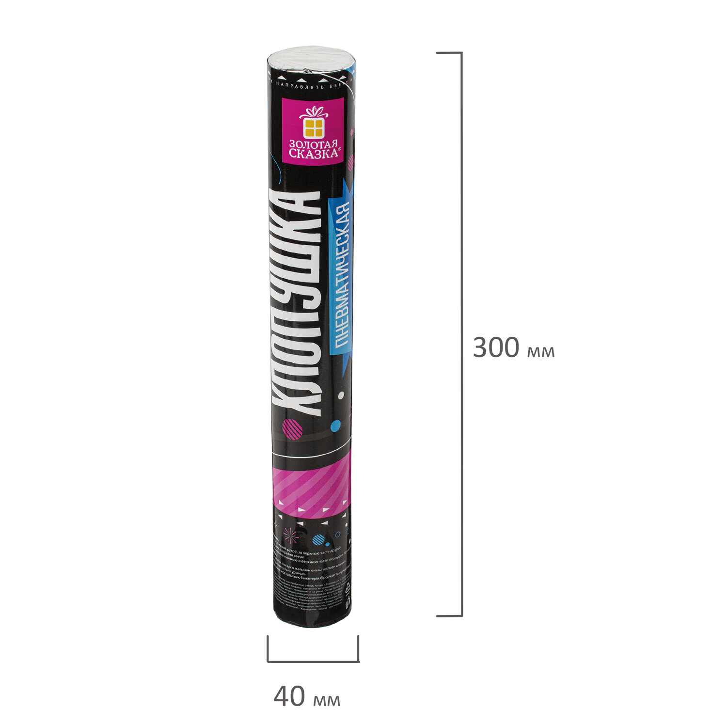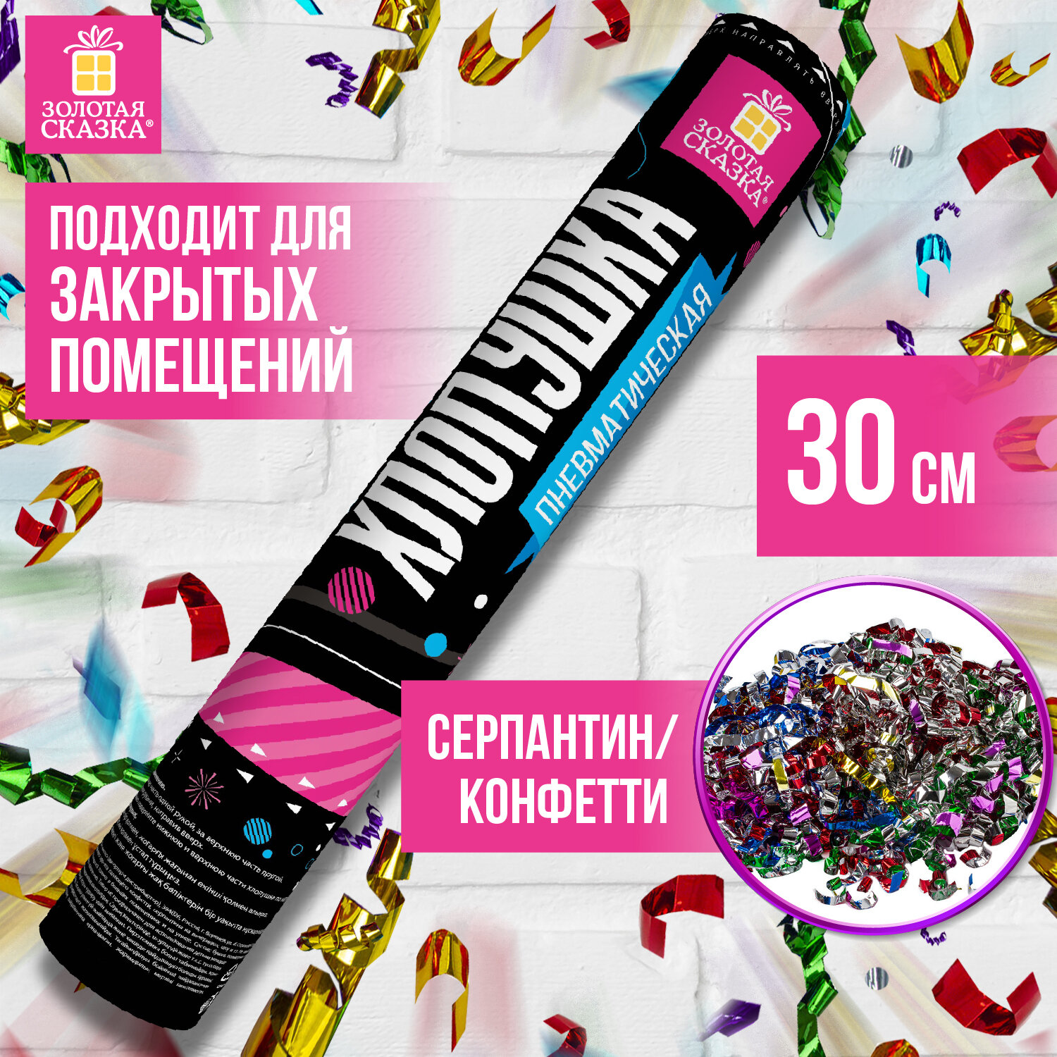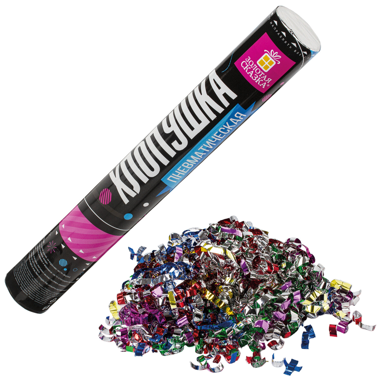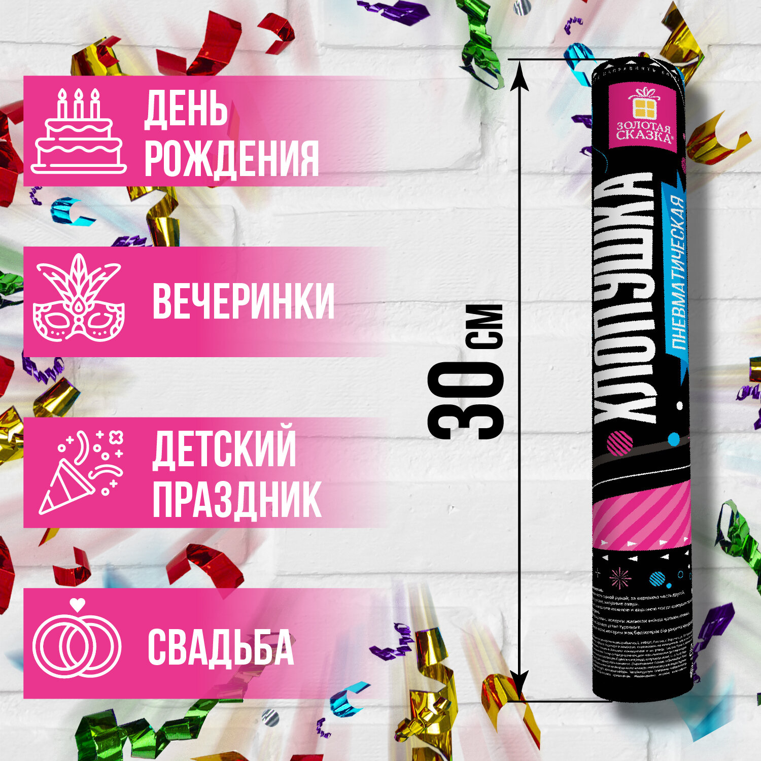 Хлопушка пневматическая ЗОЛОТАЯ СКАЗКА 30 см, фольга, серпантин, ассорти Код товара: 591474 121,65 ₽ Купить Производитель:ЗОЛОТАЯ СКАЗКА Пневматическая хлопушка ЗОЛОТАЯ СКАЗКА предназначена для создания отличного настроения и атмосферы настоящего веселья на любом празднике - новогодней вечеринке, торжестве в честь Дня Рождения, выпускном, корпоративе или любом другом праздничном событии. Хлопушка высотой 30 см с фольгированным наполнителем в виде серпантина и конфетти цвета ассорти является абсолютно безопасной. Выстрел осуществляется под действием сжатого воздуха. Не является пиротехникой. Средняя дальность выстрела – 5-7 м. Корпус хлопушки состоит из двух частей: пневматического баллона со сжатым воздухом и картонного цилиндра с наполнителем. Рекомендуется использовать хлопушку внутри больших помещений или на улице.Производство: КитайТип: пневматическаяДлина: 30 смКоличество в комплекте: 1 шт.Материал наполнителя: фольгаОсновной наполнитель: серпантинЦвет наполнителя: ассортиВес: 143 грРазмер упаковки: 4.1 × 29.7 × 4.1 смОбъём: 0.0006 м3Промежуточная упаковка: 24 штТранспортная упаковка: 96 штШтрих-код: 4606224287133 Сертификат-1.jpg Сертификат-2.jpg Сертификат-3.jpg