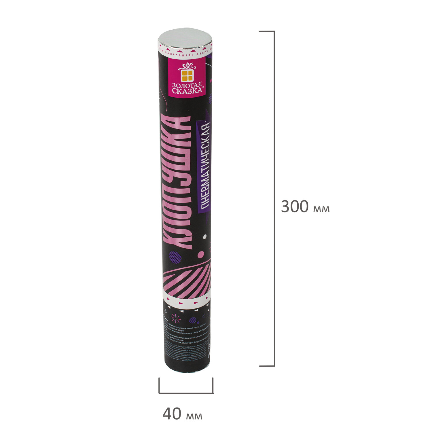 Хлопушка пневматическая ЗОЛОТАЯ СКАЗКА 30 см, фольга, круги, ассорти Код товара: 591478 121,65 ₽ Купить Производитель:ЗОЛОТАЯ СКАЗКА Пневматическая хлопушка ЗОЛОТАЯ СКАЗКА предназначена для создания отличного настроения и настоящего веселья на любом празднике - новогодней вечеринке, торжестве в честь Дня Рождения, выпускном, корпоративе или любом другом праздничном событии. Хлопушка высотой 30 см с фольгированным круглым наполнителем цвета ассорти является абсолютно безопасной. Выстрел осуществляется под действием сжатого воздуха. Не является пиротехникой. Средняя дальность выстрела – 5-7 м. Корпус хлопушки состоит из двух частей: пневматического баллона со сжатым воздухом и картонного цилиндра с наполнителем. Рекомендуется использовать хлопушку внутри больших помещений или на улице.Производство: КитайТип: пневматическаяДлина: 30 смКоличество в комплекте: 1 шт.Материал наполнителя: фольгаОсновной наполнитель: кругиЦвет наполнителя: ассортиВес: 148 грРазмер упаковки: 3.6 × 29.7 × 3.6 смОбъём: 0.0006 м3Промежуточная упаковка: 24 штТранспортная упаковка: 96 штШтрих-код: 4606224287171 Сертификат-1.jpg Сертификат-2.jpg Сертификат-3.jpg
