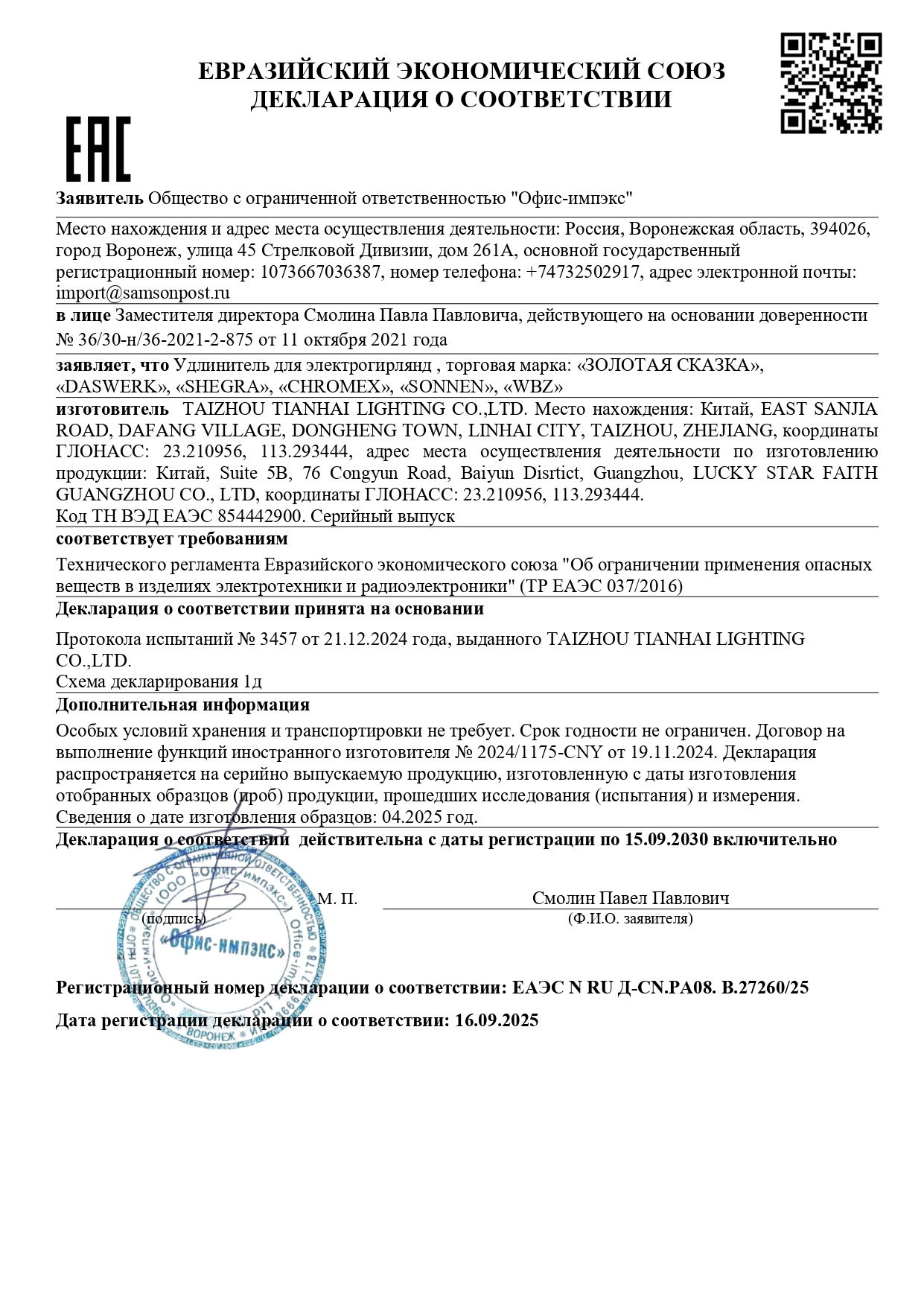 Удлинитель для электрогирлянд 3 м, прозрачный шнур, пакет, ЗОЛОТАЯ СКАЗКА Ликвидация Код товара: 591712 131,1 ₽ Купить Производитель:ЗОЛОТАЯ СКАЗКА Удлинитель для электрогирлянд ЗОЛОТАЯ СКАЗКА – отличное решение, чтобы удлинить систему электрогирлянд. Удлинитель является абсолютно универсальным за счет прозрачного цвета и впишется в любой праздничный интерьер. Электрический удлинитель представляет собой медный провод, помещенный в термическую усадочную трубку из поливинилхлорида, оснащенную штепсельной вилкой с одного конца провода и штепсельной розеткой – с другой. Тип используемой штепсельной вилки для соединения с источником питания – europlug (CEE 7/4). Данный тип вилки рассчитан на напряжение до 230 В и ток силой до 16 А. Длина провода – 3 м. Удлинитель предназначен для подключения электрогирлянд в местах, удалённых от стационарных розеток, и только внутри помещений.Производство: КитайИспользование: помещениеТип электрогирлянды: удлинительКоличество режимов: 0Длина: 3 мМощность: 12 ВтКоличество ламп: 0 шт.Тип ламп: нет данныхФорма ламп/фигуры: нет данныхЦвет ламп: нет данныхЦвет провода: прозрачныйПитание: сеть, 220 ВУпаковка единицы товара: пакет с европодвесомВес: 68 грРазмер упаковки: 2.6 × 12.4 × 5.6 смОбъём: 0.0002 м3Промежуточная упаковка: 50 штТранспортная упаковка: 50 штШтрих-код: 4606224328324 Файлы Сертификат-1.jpg Сертификат-2.jpg Сертификат-3.jpg Сертификат-4.jpg Сертификат-5.jpg Сертификат-6.jpg Сертификат-7.jpg