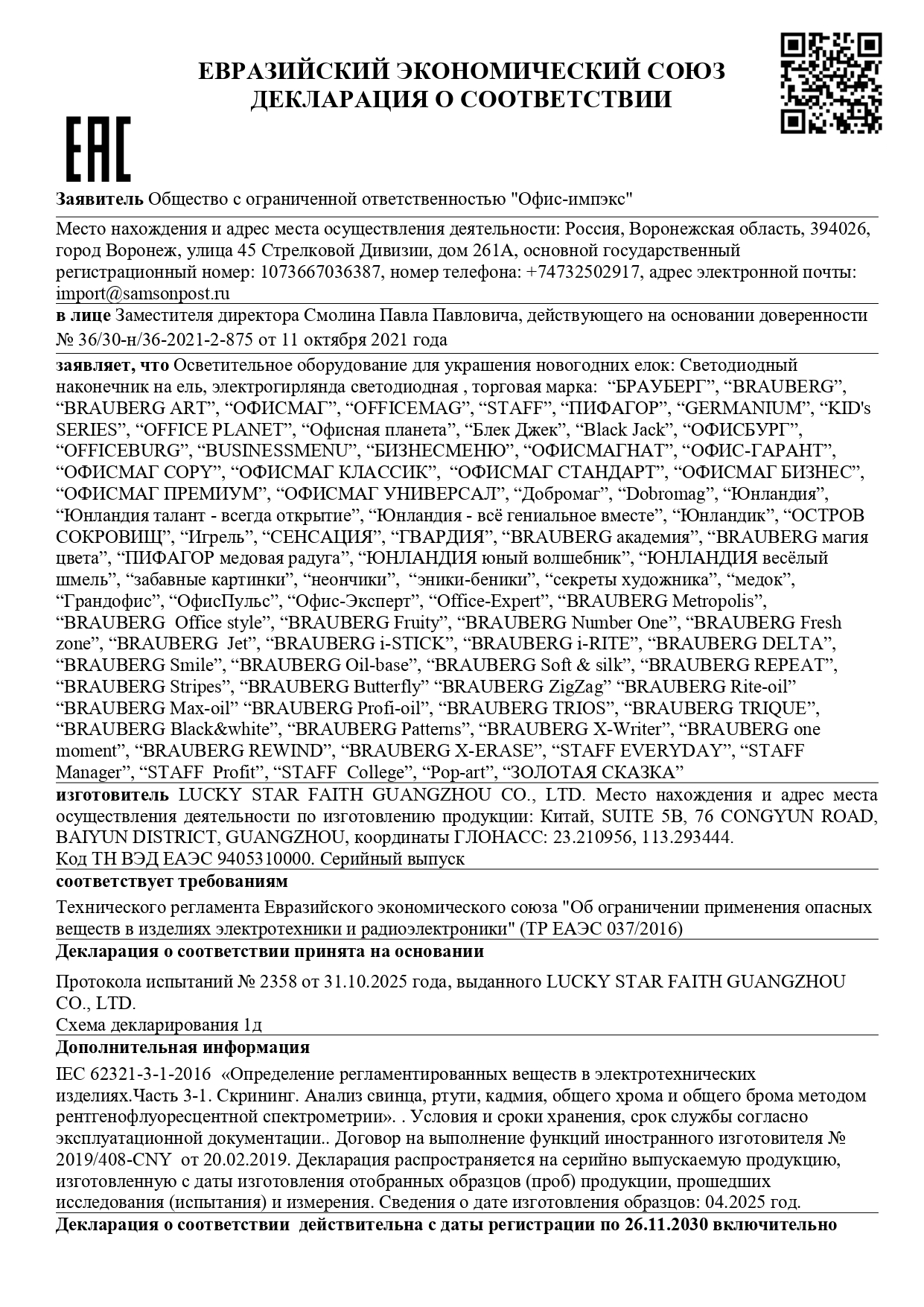 Электрогирлянда-нить комнатная "Диско-шары", 1,5 м,10 LED, тёплый белый, батарейки, ЗОЛОТАЯ СКАЗКА Код товара: 591731 453,75 ₽ Купить Производитель:ЗОЛОТАЯ СКАЗКА Светодиодная гирлянда ЗОЛОТАЯ СКАЗКА – это яркий, красочный и эффектный спутник любого праздничного события. Мягкий и вместе с тем насыщенный свет этого украшения позволит создать магическую и праздничную атмосферу внутри помещений. Электрическая светодиодная гирлянда представляет собой светодиоды, соединенные между собой электрическим проводом. Тип конструкции – "Нить". Длина рабочей части гирлянды составляет 1,5 м. Форма – "диско-шары", внутри которых находятся светодиодные лампы 10 шт. Диаметр шара – 4 см. Лампы сделаны на основе технологии LED, которая является более безопасной и эффективной по сравнению с лампой накаливания. Цвет свечения гирлянды – теплый белый. Конструкцией гирлянды не предусмотрено наличие контроллера для переключения режимов – режим свечения один, и он постоянный. Гирлянда работает от 2 батареек типа AA.Батарейки не входят в комплект! Перед началом работы новой гирлянды необходимо убрать прозрачный предохранитель. Допускается использование только внутри помещений.Производство: КитайИспользование: помещениеТип электрогирлянды: Нить "Декоративная"Количество режимов: 1Длина: 1.5 мМощность: 0.6 ВтКоличество ламп: 10 шт.Тип ламп: светодиоднаяФорма ламп/фигуры: диско-шарыЦвет ламп: теплый белыйЦвет провода: прозрачныйПитание: батарейки AA, 2 шт.Упаковка единицы товара: картонная коробкаВес: 205 грРазмер упаковки: 9.9 × 15 × 9 смОбъём: 0.0017 м3Промежуточная упаковка: 24 штТранспортная упаковка: 24 штШтрих-код: 4606224511245 Файлы Сертификат-1.jpg Сертификат-2.jpg Сертификат-3.jpg Сертификат-4.jpg