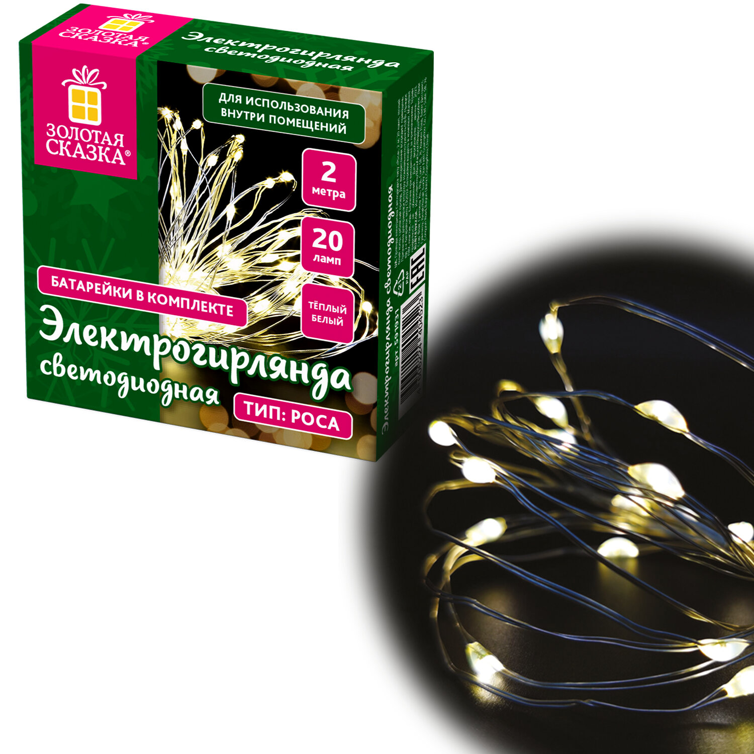 Электрогирлянда-нить комнатная "Роса" 2 м, 20 LED, теплый белый свет, на батарейках, ЗОЛОТАЯ СКАЗКА Ликвидация Код товара: 591931 77,01 ₽ Купить Производитель:ЗОЛОТАЯ СКАЗКА Универсальная модель гирлянды, не зависящая от доступа к сети, которой можно украсить как новогоднюю ель, так и интерьер. Мягкий, но вместе с тем насыщенный свет этой гирлянды позволяет использовать её для создания уютного свечения внутри помещения. Электрическая светодиодная гирлянда "Роса" представляет собой светодиоды, соединенные между собой электрическим проводом. Тип конструкции - "Нить". Длина рабочей части гирлянды составляет 2 м. Количество светодиодных ламп - 20 шт. Лампы сделаны на основе технологии LED, которая является более безопасной и эффективной по сравнению с лампой накаливания. Цвет свечения гирлянды - теплый белый. Конструкцией гирлянды не предусмотрено наличие контроллера для переключения режимов, режим свечения один, и он постоянный. Гирлянда работает от 2-х батареек типа CR2032. Батарейки уже входят в комплект! Перед началом работы новой гирлянды необходимо убрать прозрачный предохранитель. Допускается использование только внутри помещений.Производство: КитайИспользование: помещениеТип электрогирлянды: Нить "Роса"Количество режимов: 1Длина: 2 мМощность: 0.8 ВтКоличество ламп: 20 шт.Тип ламп: светодиоднаяФорма ламп/фигуры: капляЦвет ламп: теплый белыйЦвет провода: серебристыйПитание: батарейки CR2032, 2 шт.Упаковка единицы товара: картонная коробкаВес: 25 грРазмер упаковки: 2.6 × 6.9 × 7 смОбъём: 0.0002 м3Промежуточная упаковка: 200 штТранспортная упаковка: 200 штШтрих-код: 4606224404523 Сертификат-1.jpg Сертификат-2.jpg Сертификат-3.jpg