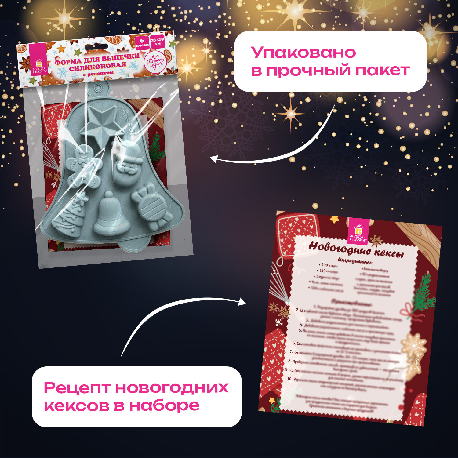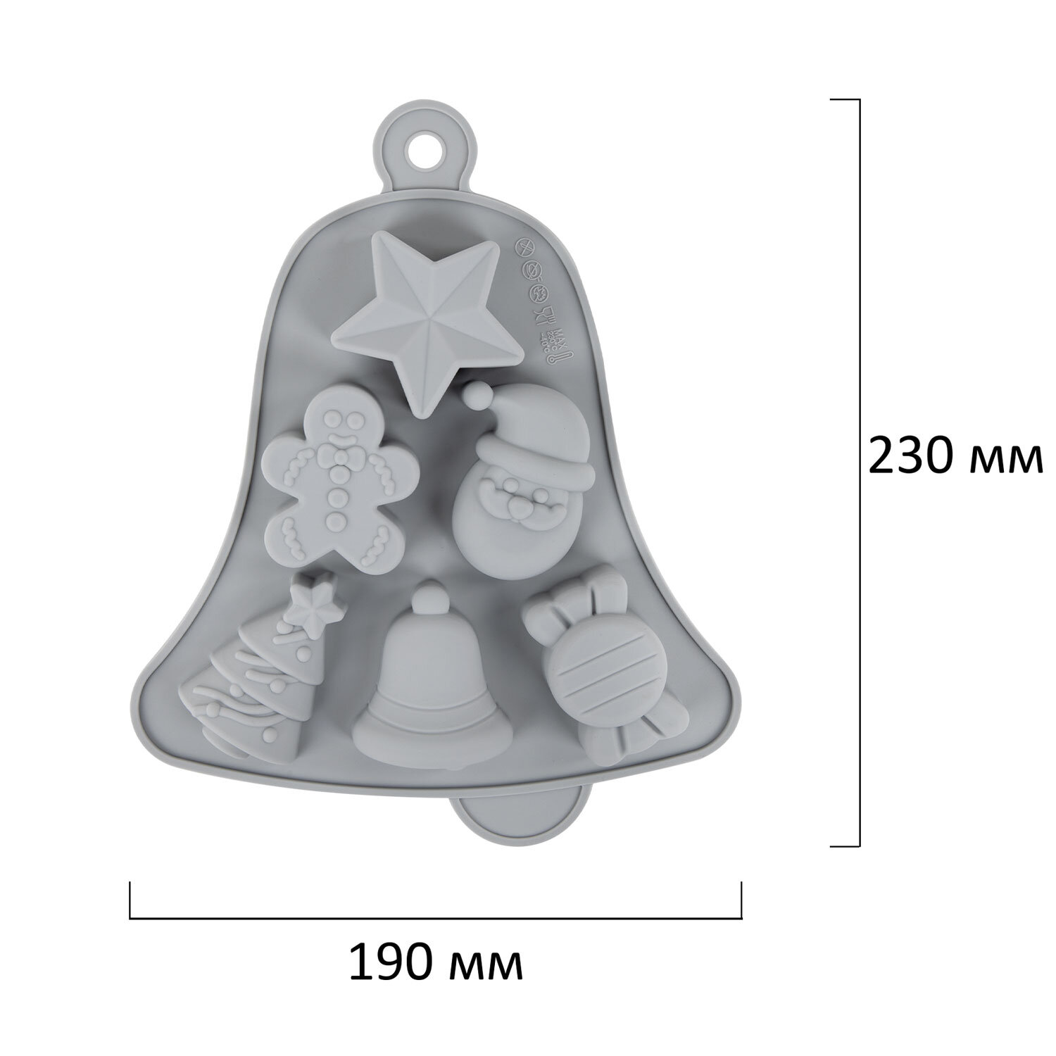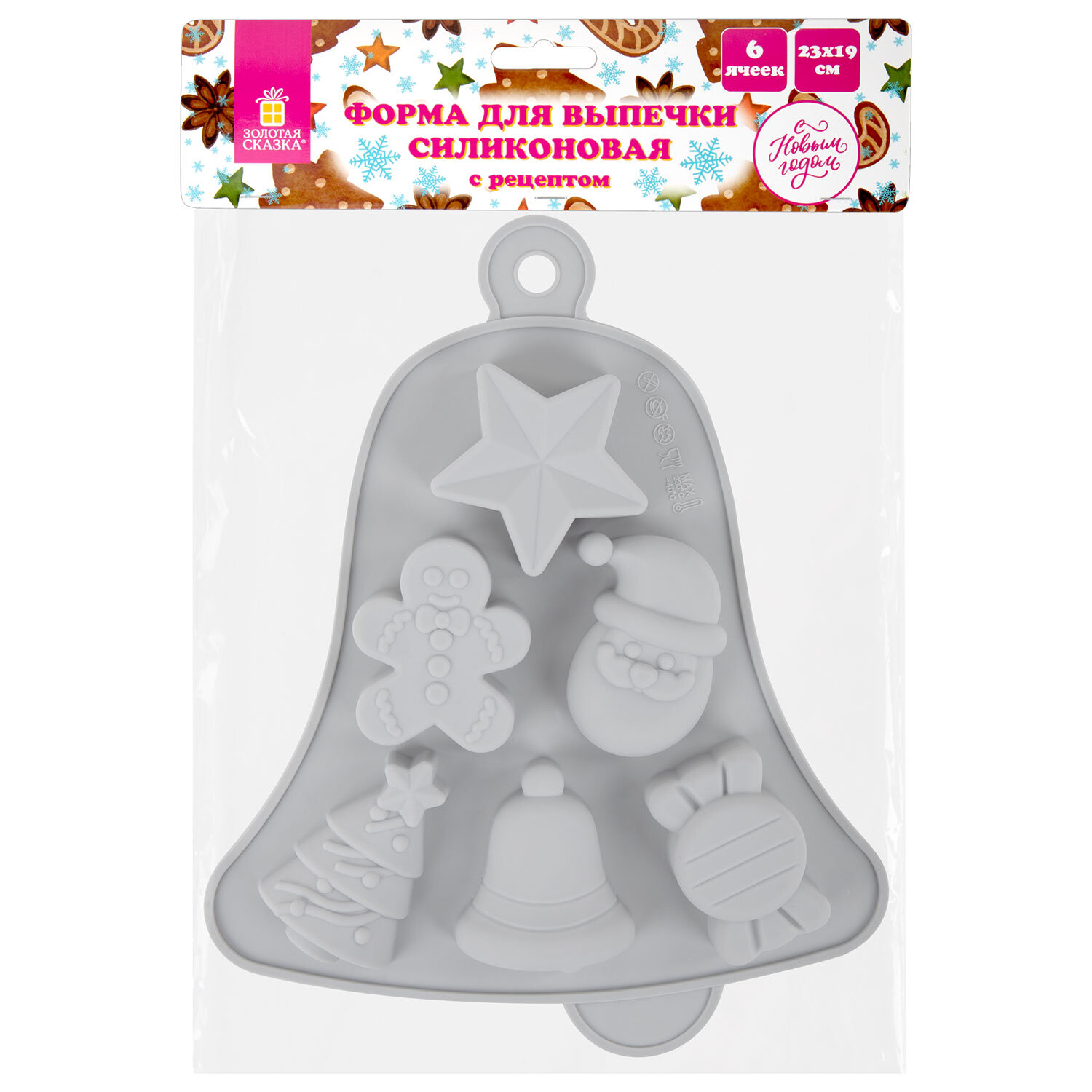 Форма для выпечки новогодняя 23х19 см, "Колокольчик", силикон, 6 ячеек, рецепт, ЗОЛОТАЯ СКАЗКА Код товара: 592469 289,02 ₽ Купить Производитель:ЗОЛОТАЯ СКАЗКА Новогодняя форма для выпечки в виде колокольчика ЗОЛОТАЯ СКАЗКА – создавайте праздничное настроение с каждым кексом! Подарите себе и своим близким радость творчества и аромат настоящего домашнего праздника. Формочка для выпечки выполнена в интересном рождественском дизайне в виде колокольчика и 6 аккуратных ячеек разных дизайнов (колокольчик, звездочка, праздничная елочка, весёлый Дед Мороз, забавный пряничный человечек и конфетка). Она превратит обычную выпечку в настоящее произведение искусства! Изготовленная из пищевого силикона, форма идеально подходит для использования в духовке, микроволновой печи, посудомоечной машине и морозильной камере. Размер формы – 23х19 см. Температурный диапазон использования от -40 до +230 °C гарантирует её долговечность и безопасность. Выпечка легко извлекается из формы, сохраняя все детали праздничного дизайна. В комплекте Вас ждёт рецепт вкусных новогодних кексов, чтобы Вы сразу могли приступить к созданию своего праздничного шедевра. Подарочная упаковка делает формочку отличным сувениром для близких, друзей и коллег.Производство: КитайТип товара: форма для выпечкиРазмер: 23х19 смКоличество в комплекте: 1 шт.Цвет: голубойДизайн: КолокольчикВес: 117 грРазмер упаковки: 2.8 × 23.8 × 22.3 смОбъём: 0.0013 м3Промежуточная упаковка: 5 штТранспортная упаковка: 60 штШтрих-код: 4606224503554 Сертификат-1.jpg Сертификат-2.jpg Сертификат-3.jpg