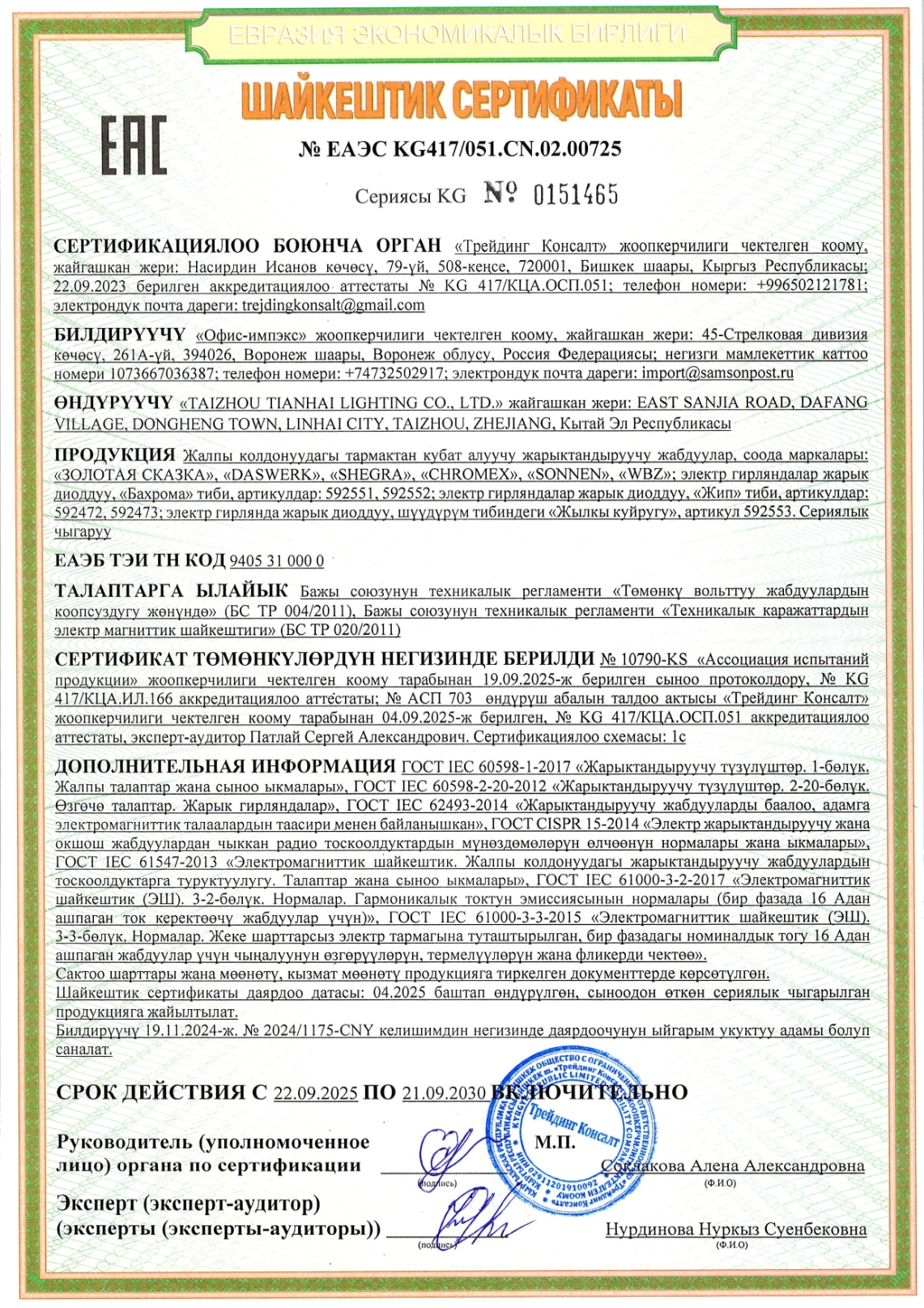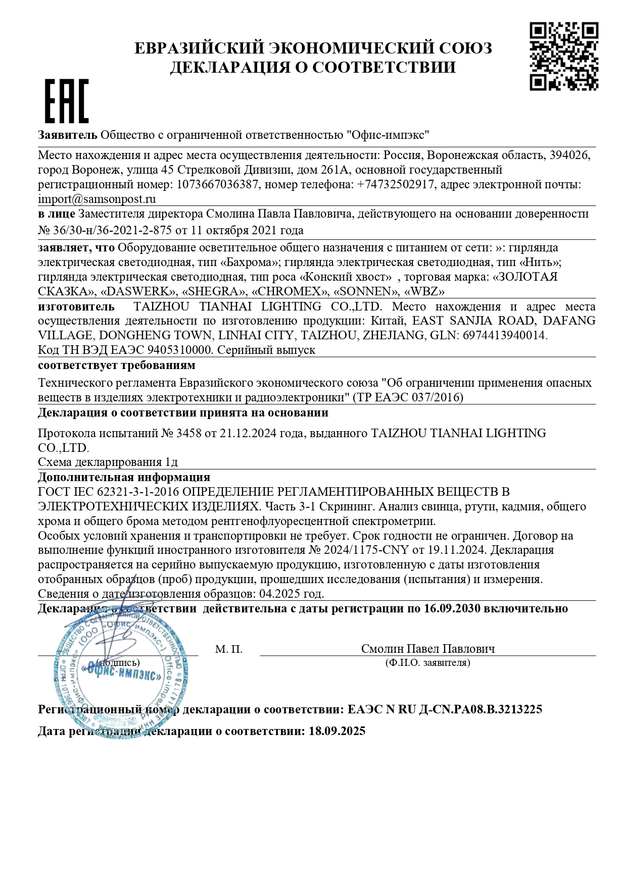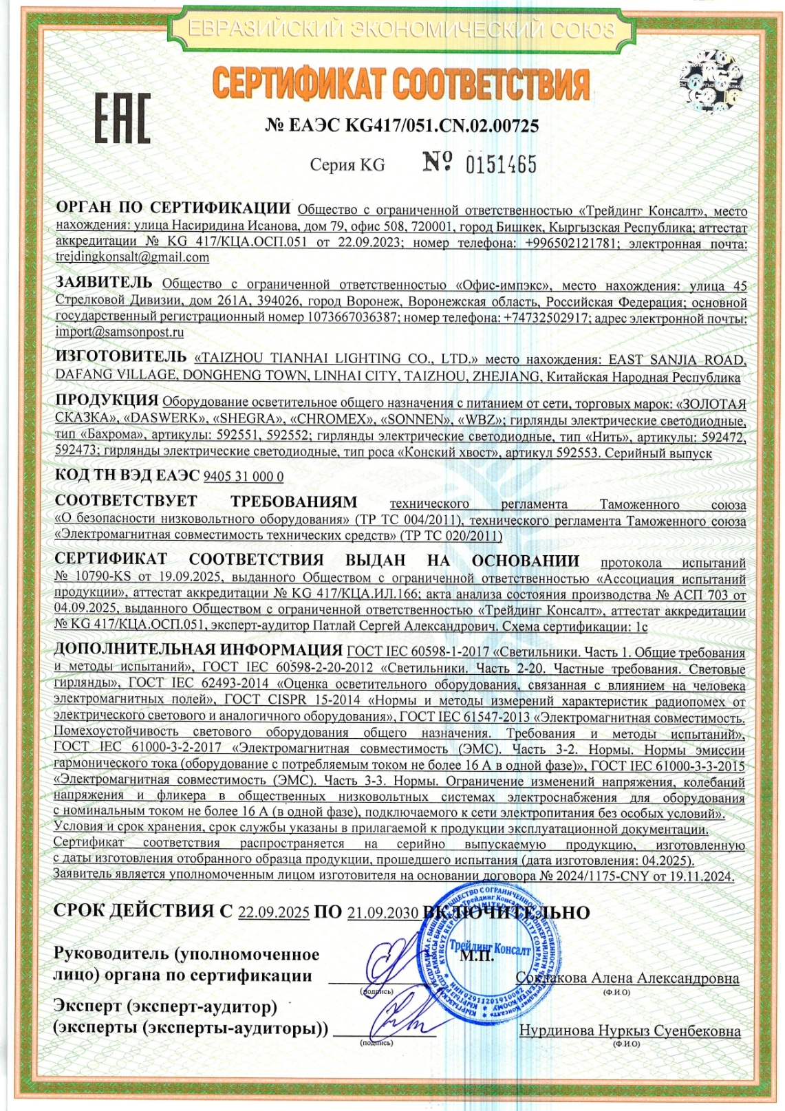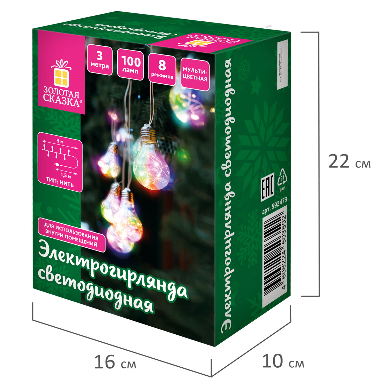 Электрогирлянда-нить комнатная "Лампочки", 3 м, 100 LED, мультицветная, 220 V, контроллер, ЗОЛОТАЯ СКАЗКА Код товара: 592473 509,49 ₽ Купить Производитель:ЗОЛОТАЯ СКАЗКА Самая популярная и универсальная модель электрогирлянды, которой можно украсить как новогоднюю ель, так и интерьер любого помещения. Тип "Нить" предусматривает последовательное соединение ламп гирлянды в электрическую цепь. На проводе располагаются 10 лампочек, в каждой из которых расположена гирлянда - нить в форме спирали по 10 диодов в каждой. Итого на гирлянде установлено 100 светодиодных лампочек. Цвет свечения гирлянды – мультицветный. Конструкцией гирлянды предусмотрено наличие контроллера для принудительного переключения между режимами свечения. Количество режимов свечения – 8 шт. Прибор работает от сети. Номинальное напряжение электрической цепи гирлянды составляет 220 V. Тип используемой штепсельной вилки для соединения с источником питания – europlug (CEE 7/4). Данный тип вилки рассчитан на напряжение до 220 V. Допускается использование только внутри помещений.Производство: КитайИспользование: помещениеТип электрогирлянды: Нить "Декоративная"Количество режимов: 8Наличие контроллера: даДлина: 3 мМощность: 4 ВтКоличество ламп: 100 шт.Тип ламп: светодиоднаяФорма ламп/фигуры: лампочкаЦвет ламп: мультицветныйЦвет провода: прозрачныйПитание: сеть, 220 ВУпаковка единицы товара: картонная коробкаВес: 308 грРазмер упаковки: 10.6 × 22.2 × 16.3 смОбъём: 0.0045 м3Промежуточная упаковка: 12 штТранспортная упаковка: 12 штШтрих-код: 4606224503592 Файлы Сертификат-1.jpg Сертификат-2.jpg Сертификат-3.jpg Сертификат-4.jpg Сертификат-5.jpg