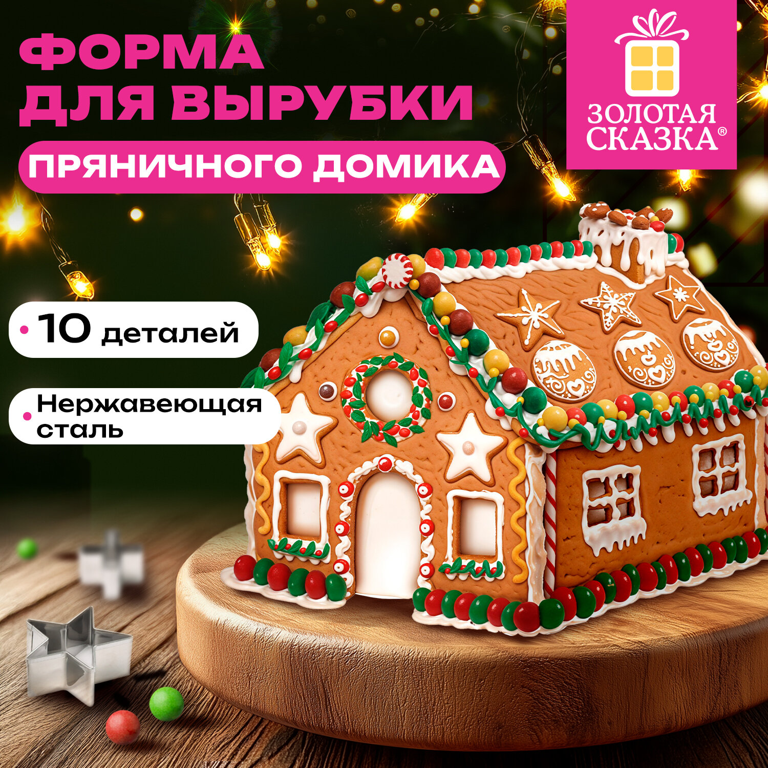 Набор вырубок для печенья, 10 деталей, "Пряничный домик", нержавеющая сталь, рецепт, ЗОЛОТАЯ СКАЗКА Код товара: 592493 351 ₽ Купить Производитель:ЗОЛОТАЯ СКАЗКА Новогодний набор вырубок для печенья ЗОЛОТАЯ СКАЗКА позволит создать волшебный пряничный домик своими руками! Ваши праздники станут ещё вкуснее и веселее! С набором вырубок для печенья ЗОЛОТАЯ СКАЗКА из 10 деталей вы легко превратите обычную выпечку в настоящее творчество. Вырубки, выполненные из нержавеющей стали, помогут аккуратно вырезать заготовки для стен, крыши, окон и декоративных элементов – всё, что нужно для постройки уютного пряничного домика. Это не просто печенье, это целое творческое событие, которое объединяет всю семью. Размер форм: Передняя/задняя стена – 12,3х14 см. Потолок/пол – 10х17 см. Боковые стены – 14,4х8 см. Дверь – 3х6 см. Переднее/заднее окно – 2х3 см. Круглое окно – диаметр 3,1 см. Квадратное окно – 2,8х2,8 см. Деления на окнах – 2,7х2,7 см. Дымоход – 2,6х3 см. Декор "звезда" – 3,4х3,4 см. Внутри яркой подарочной коробки вас ждёт подробный рецепт приготовления пряничного домика – от замешивания теста до финального украшения глазурью.Производство: КитайТип товара: формы для печеньяРазмер: ассорти смКоличество в комплекте: 10 шт.Цвет: серебристыйДизайн: пряничный домикВес: 244 грРазмер упаковки: 3.4 × 24.7 × 18.1 смОбъём: 0.0017 м3Промежуточная упаковка: 40 штТранспортная упаковка: 40 штШтрих-код: 4606224503790 Файлы Сертификат-1.jpg Сертификат-2.jpg Сертификат-3.jpg Сертификат-4.jpg