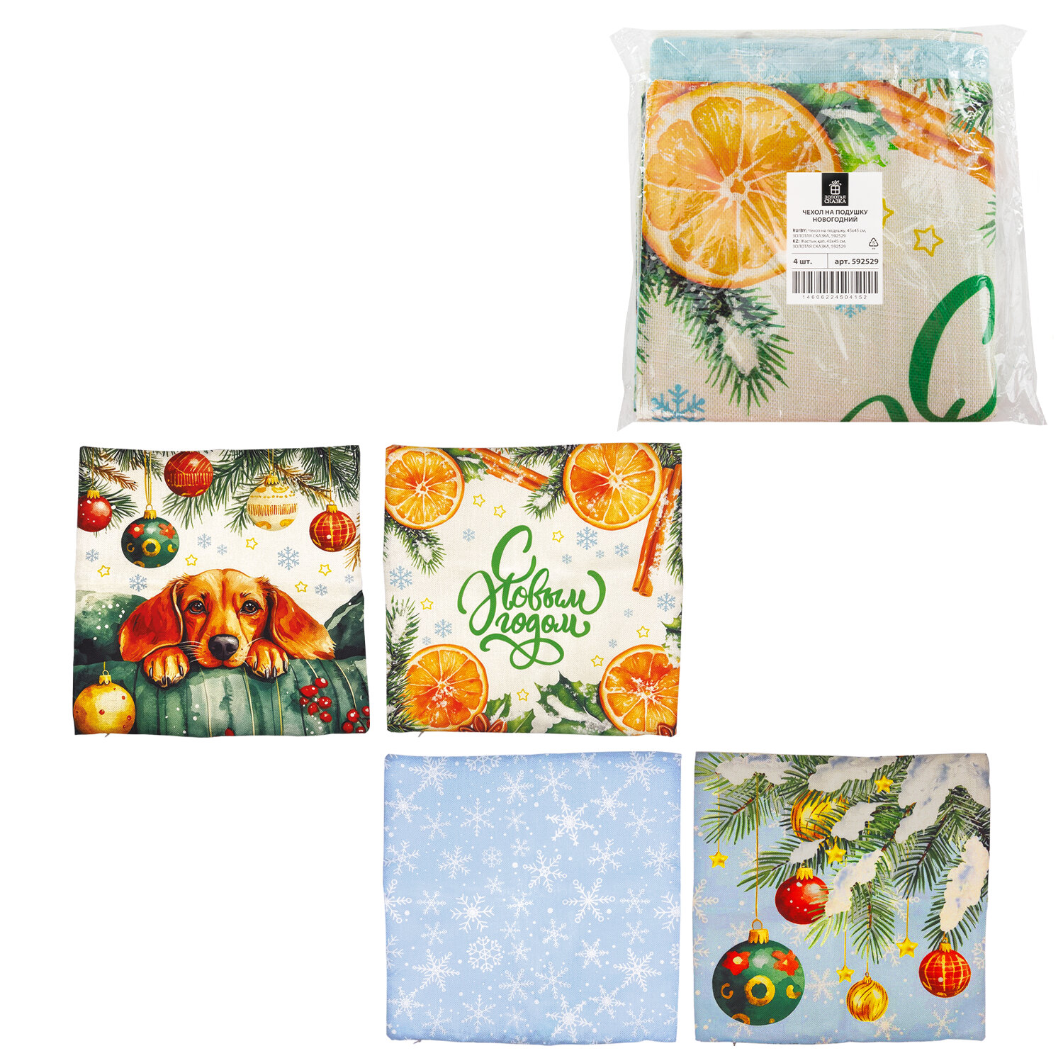 Чехол на подушку новогодний (1 шт.) 45х45 см, "X-mas Magic", полиэстер, ассорти 4 дизайна, ЗОЛОТАЯ СКАЗКА Код товара: 592529 166,59 ₽ Купить Производитель:ЗОЛОТАЯ СКАЗКА Создайте атмосферу тепла и праздника с очаровательными и стильными новогодними декоративными чехлами на подушки ЗОЛОТАЯ СКАЗКА! Чехлы новогодние размером 45х45 см идеально подходит для стандартных декоративных подушек. Чехлы выполнены из полиэстера и украшены яркими новогодними мотивами: апельсины, елочные шары, милая собачка и, конечно же, снежинки (ассорти без возможности выбора). Оснащение молнией позволяет быстро надевать и снимать чехол, что делает его особенно практичным при уходе за подушкой. Каждый чехол имеет индивидуальный пластиковый крючок и бумажный хэнгтэг.Производство: КитайТип товара: Чехол на подушкуРазмер: 45х45 смКоличество в комплекте: 1 шт.Цвет: ассортиДизайн: X-mas MagicВес: 73 грРазмер упаковки: 0.3 × 45.4 × 45.4 смОбъём: 0.0003 м3Промежуточная упаковка: 4 штТранспортная упаковка: 96 штШтрих-код: 4606224504155 Сертификат-1.jpg Сертификат-2.jpg