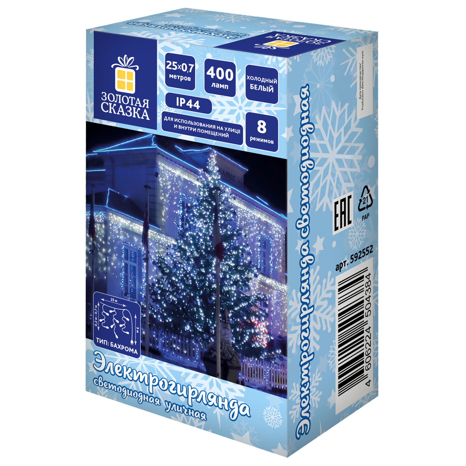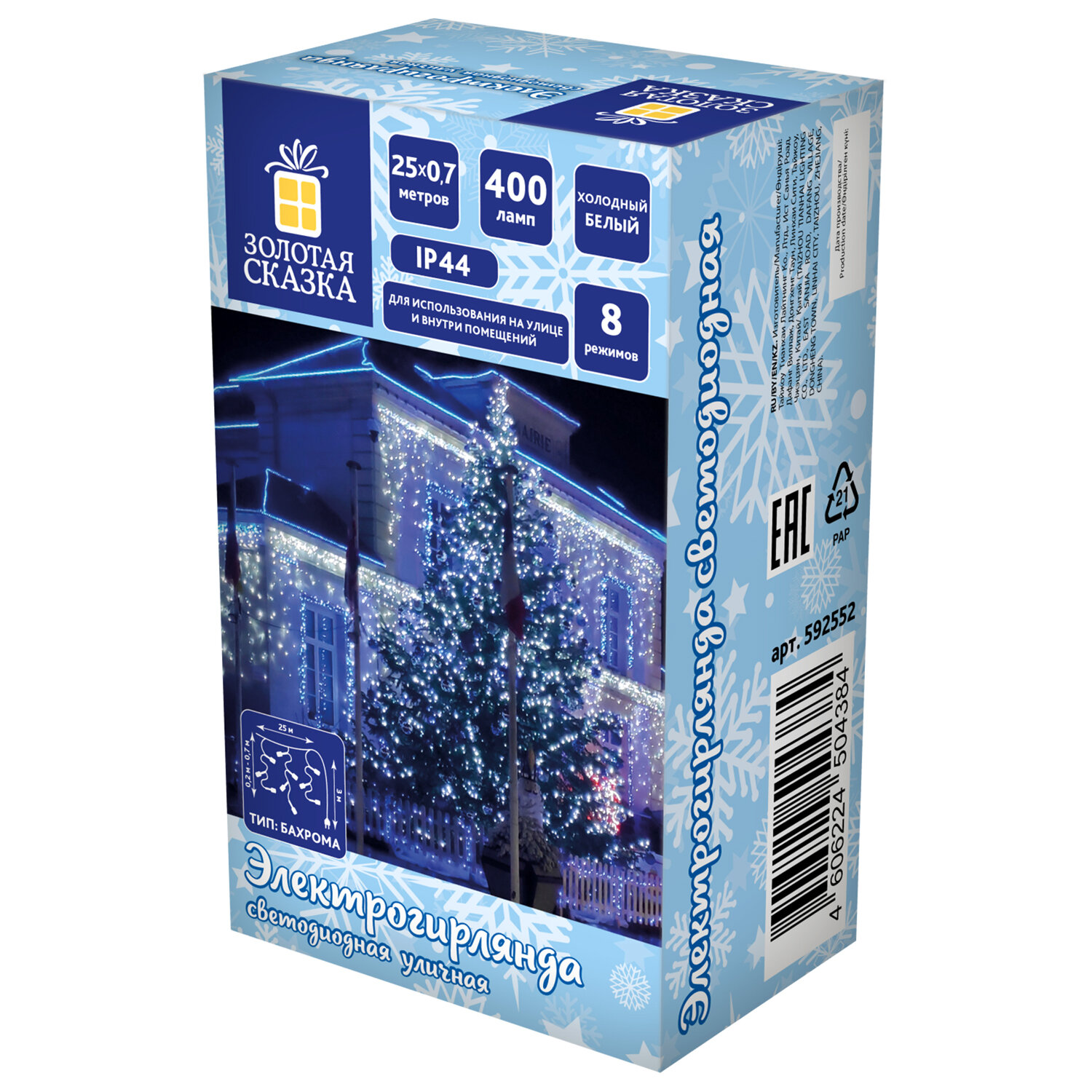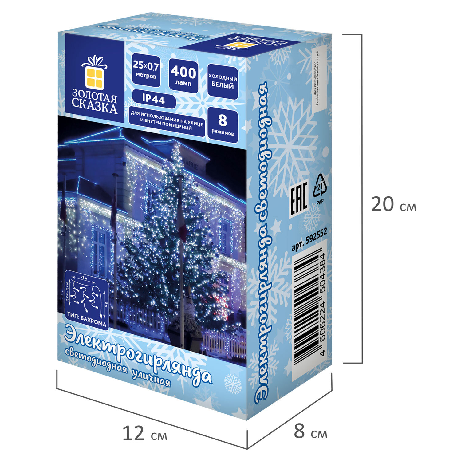 Электрогирлянда-бахрома уличная 25х0,7 м, 400 LED, холодный белый, 220 V, контроллер, ЗОЛОТАЯ СКАЗКА Код товара: 592552 1 087,74 ₽ Купить Производитель:ЗОЛОТАЯ СКАЗКА Электрогирлянда "Бахрома" – один из самых популярных видов гирлянд сегодня. Мягкий, но насыщенный свет этих украшений помогает создать уютное свечение в помещении. Гирлянда представляет собой светодиоды, соединенные между собой электрическим проводом. Тип конструкции электрогирлянды – "Бахрома". Гирлянда "Бахрома" состоит из горизонтального провода, по всей ширине которого на равном расстоянии друг от друга располагаются вертикальные нити различной длины со светодиодами. Такой тип гирлянды чаще всего используют для декорирования оконных проемов, стен, потолков, витрин, карнизов и прочего. Длина рабочей части гирлянды составляет 25х0,7 м. Длина основного провода рабочей части гирлянды составляет 25х0,7 м, длина кабеля питания – 3 м. Количество светодиодных ламп – 400 шт. Лампы сделаны на основе технологии LED, которая является более безопасной и эффективной по сравнению с лампой накаливания. В конструкции гирлянды предусмотрен контроллер, чтобы настроить свечение гирлянды по своему вкусу. Количество режимов свечения – 8 шт. Цвет свечения гирлянды – холодный белый. Гирлянда работает от сети. Номинальное напряжение электрической цепи гирлянды составляет 220 В. Электрогирлянда имеет высокую степень влагозащиты и защиты от пыли (IP44), поэтому допускается использование вне помещений.Производство: КитайИспользование: помещение, улицаТип электрогирлянды: "Бахрома"Количество режимов: 8Наличие контроллера: даДлина: 25 мШирина: 0.7 мМощность: 10 ВтКоличество ламп: 400 шт.Тип ламп: светодиоднаяФорма ламп/фигуры: цилиндрЦвет ламп: холодный белыйЦвет провода: белыйПитание: сеть, 220 ВУпаковка единицы товара: картонная коробкаВес: 880 грРазмер упаковки: 8.6 × 21.1 × 12.9 смОбъём: 0.0031 м3Промежуточная упаковка: 12 штТранспортная упаковка: 12 штШтрих-код: 4606224504384 Файлы Сертификат-1.jpg Сертификат-2.jpg Сертификат-3.jpg Сертификат-4.jpg Сертификат-5.jpg
