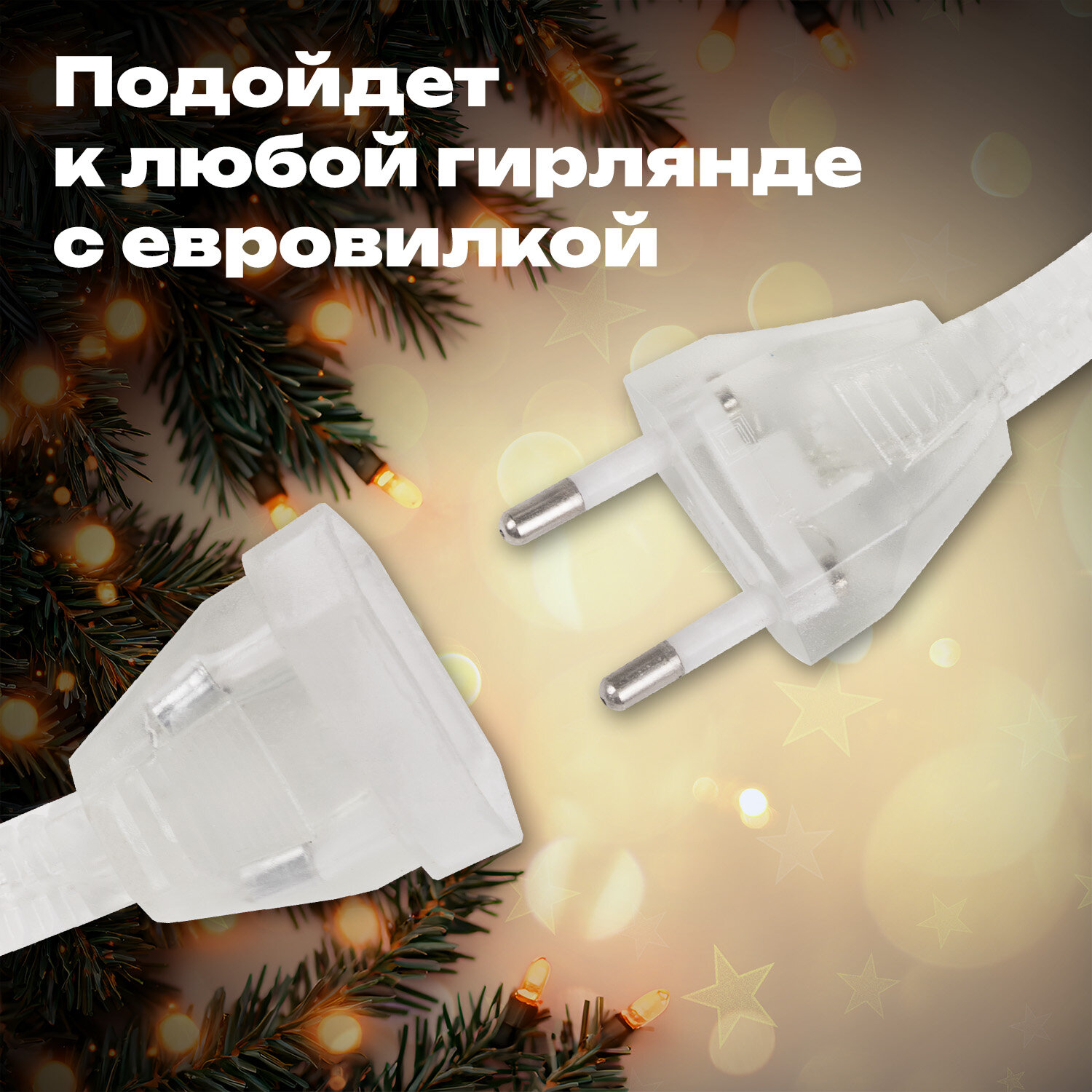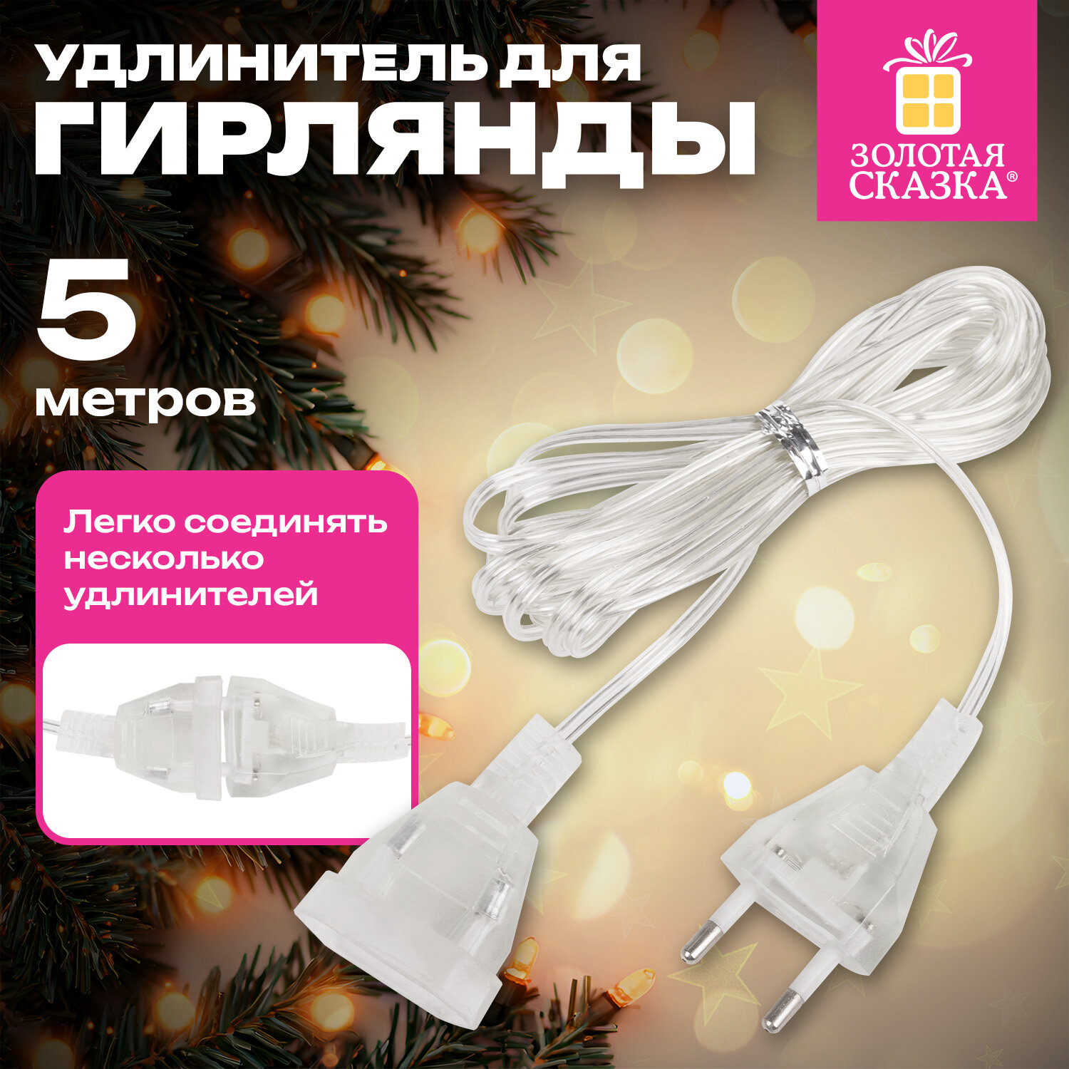 Удлинитель для электрогирлянд 5 м, прозрачный шнур, пакет, ЗОЛОТАЯ СКАЗКА Код товара: 592555 388,45 ₽ Купить Производитель:ЗОЛОТАЯ СКАЗКА Удлинитель для электрогирлянд ЗОЛОТАЯ СКАЗКА – отличное решение для увеличения длины гирлянды. Удлинитель универсален за счет прозрачного цвета и впишется в любой праздничный интерьер. Электрический удлинитель представляет собой медный провод, помещенный в термическую усадочную трубку из поливинилхлорида, оснащенную штепсельной вилкой с одного конца провода и штепсельной розеткой – с другой. Тип используемой штепсельной вилки для соединения с источником питания – europlug (CEE 7/4). Данный тип вилки рассчитан на напряжение до 230 В и ток силой до 16 А. Длина провода – 5 м. Удлинитель предназначен для подключения электрогирлянд в местах, удалённых от стационарных розеток, и только внутри помещений.Производство: КитайИспользование: помещениеТип электрогирлянды: удлинительКоличество режимов: 1Длина: 5 мМощность: 10 ВтКоличество ламп: 0 шт.Тип ламп: 0Форма ламп/фигуры: 0Цвет ламп: 0Цвет провода: прозрачныйПитание: сеть, 220 ВУпаковка единицы товара: пакет с европодвесомВес: 61 грРазмер упаковки: 3.2 × 15.3 × 7 смОбъём: 0.0002 м3Промежуточная упаковка: 50 штТранспортная упаковка: 50 штШтрих-код: 4606224504414 Файлы Сертификат-1.jpg Сертификат-2.jpg Сертификат-3.jpg Сертификат-4.jpg Сертификат-5.jpg Сертификат-6.jpg Сертификат-7.jpg
