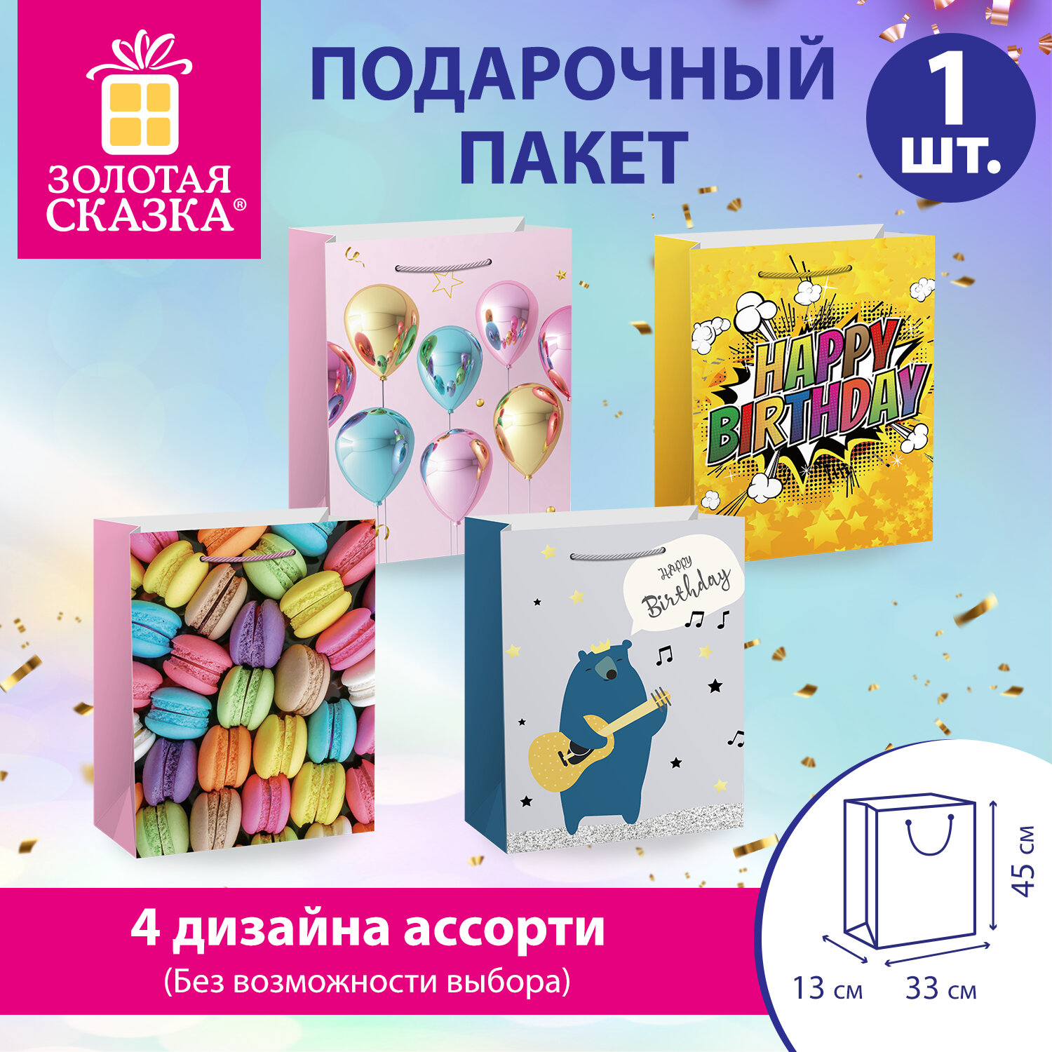 Пакет подарочный (1 штука) 33х13х45 см (XL), "Birthday Collection", ассорти, фольга, ЗОЛОТАЯ СКАЗКА Код товара: 700826 83,76 ₽ Купить Производитель:ЗОЛОТАЯ СКАЗКА Подарочный пакет "Birthday Collection" ЗОЛОТАЯ СКАЗКА – отличное решение для упаковки любого презента: пакет позволит с легкостью и со вкусом оформить выбранный подарок. Изготовлен из мелованной бумаги с веревочными ручками из полипропилена. Подарочный пакет из мелованной бумаги – идеальное решение для вашего праздника! Благодаря плотности 210 г/м2 пакет надежно удерживает свою форму и защищает содержимое, сохраняя ваш подарок в идеальном состоянии. Яркие и оригинальные дизайны (4 варианта ассорти), дополненные изысканным тиснением фольгой и сверкающим глиттером, придадут вашему подарку особый шарм и праздничное настроение. Оптимальный размер (33х13х45 см) идеально подходит для различных подарков – от маленького сюрприза до крупного презента. Удобные плетеные ручки обеспечивают комфортное ношение, добавляя элегантности и стиля вашему подарку.Производство: КитайФормат: вертикальныйВид пакета: штучныйДизайн: Birthday CollectionМатериал: мелованная бумагаКоличество в комплекте: 1 шт.С рисунком: даЦвет: ассортиРазмер пакета: XL (33x13x45) смФормат размера пакета: XLВес: 129 грРазмер упаковки: 0.3 × 46.2 × 33.6 смОбъём: 0.0005 м3Промежуточная упаковка: 12 штТранспортная упаковка: 72 штШтрих-код: 4606224498669 Файлы Сертификат-1.jpg Сертификат-2.jpg
